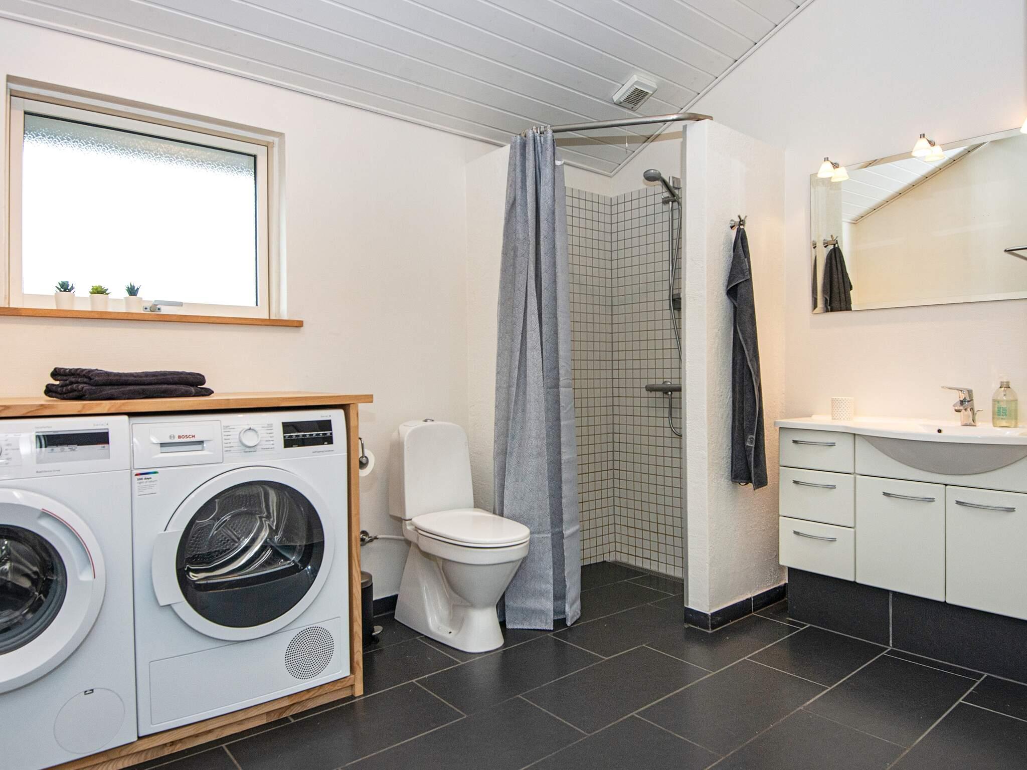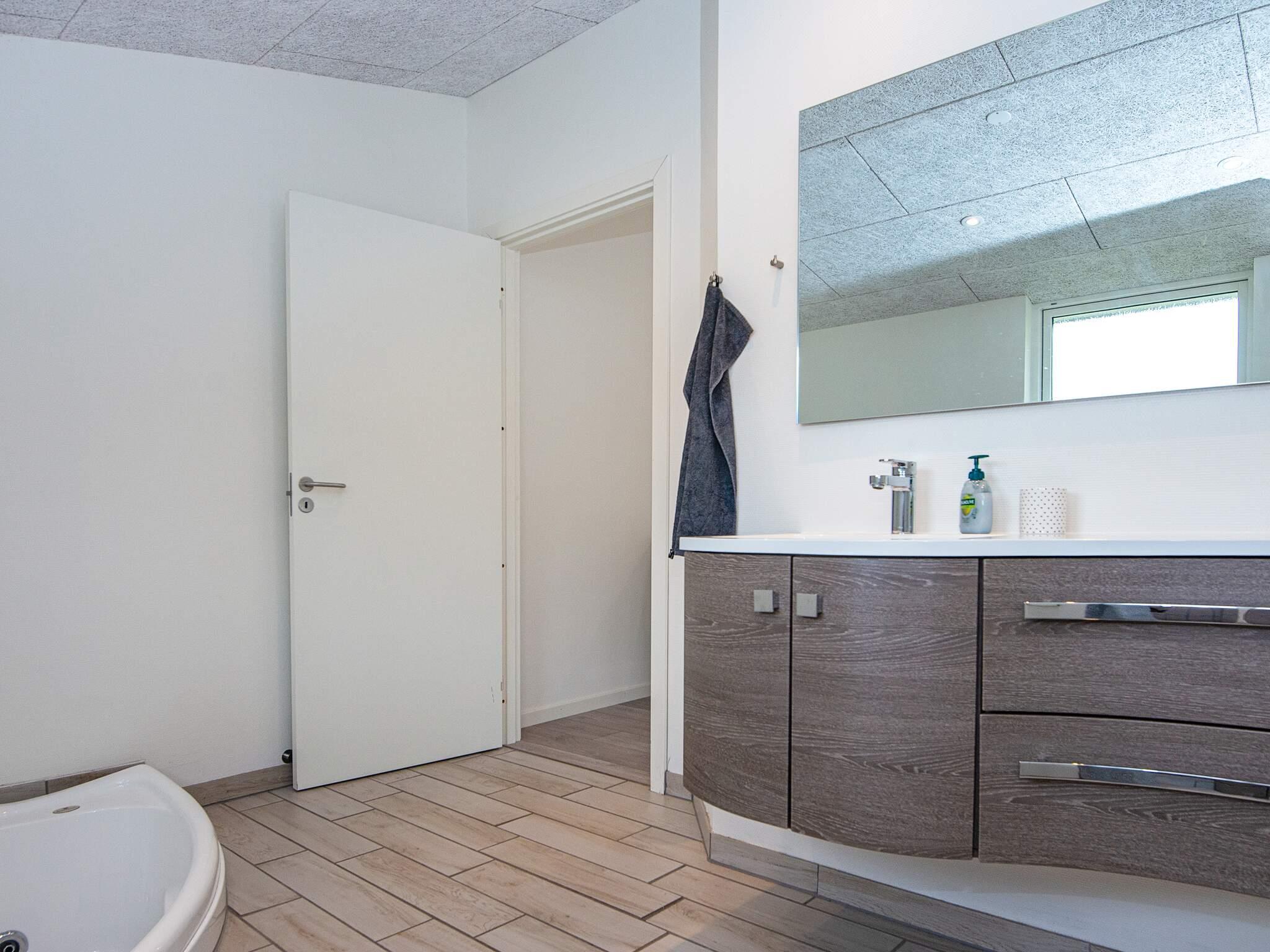 Feriehuset har to badeværelser med bruser, hvoraf det ene også har spabad. En klimavenlig luft-til-vand varmepumpe leverer den behagelige gulvvarme i hele huset.