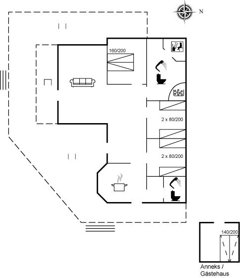 Der er i alt 4 soveværelser. Sovepladserne fordeler sig på: 2 sovepladser i dobbeltseng. 4 sovepladser i enkeltsenge. 2 sovepladser i sovesofa (dobbelt).- 2 af disse sovepladser befinder sig i et anneks. Derudover er der 1 stk. barneseng.