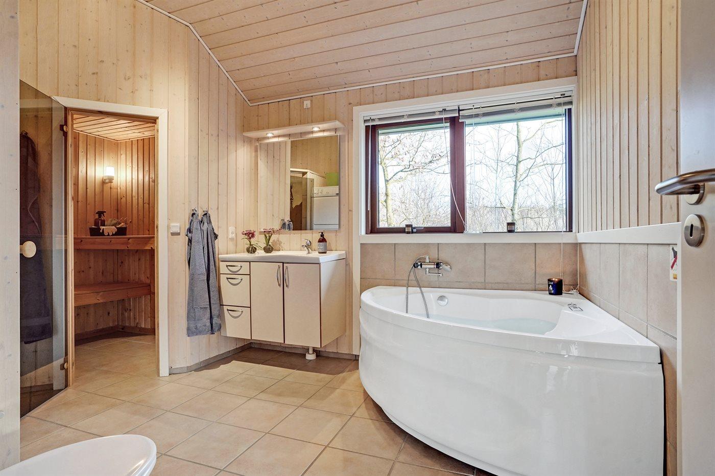 Der er 2 badeværelser med bruseniche og 2 toiletter. Der er gulvvarme på 2 badeværelser. I saunaen er der mulighed for afslapning.