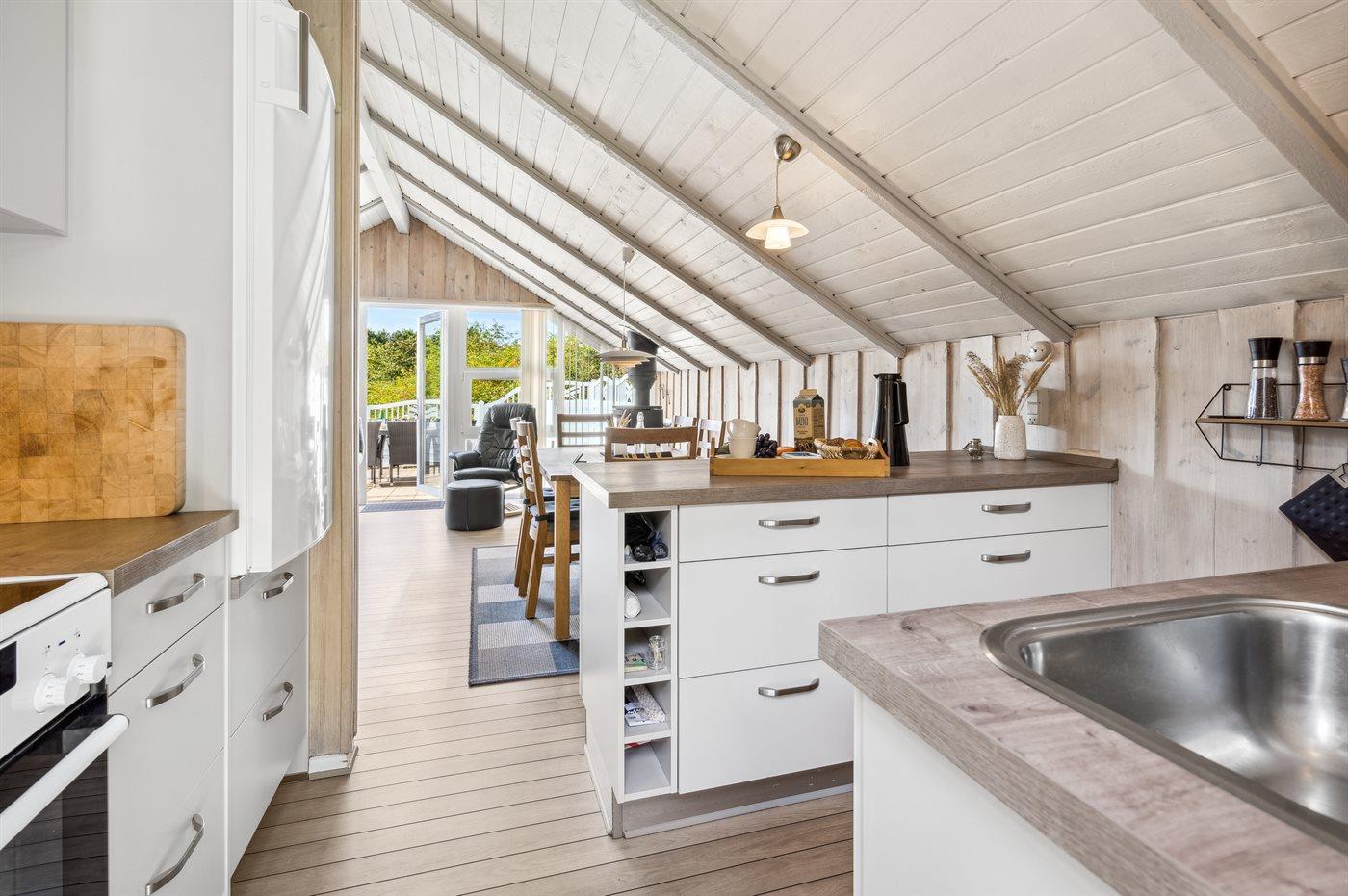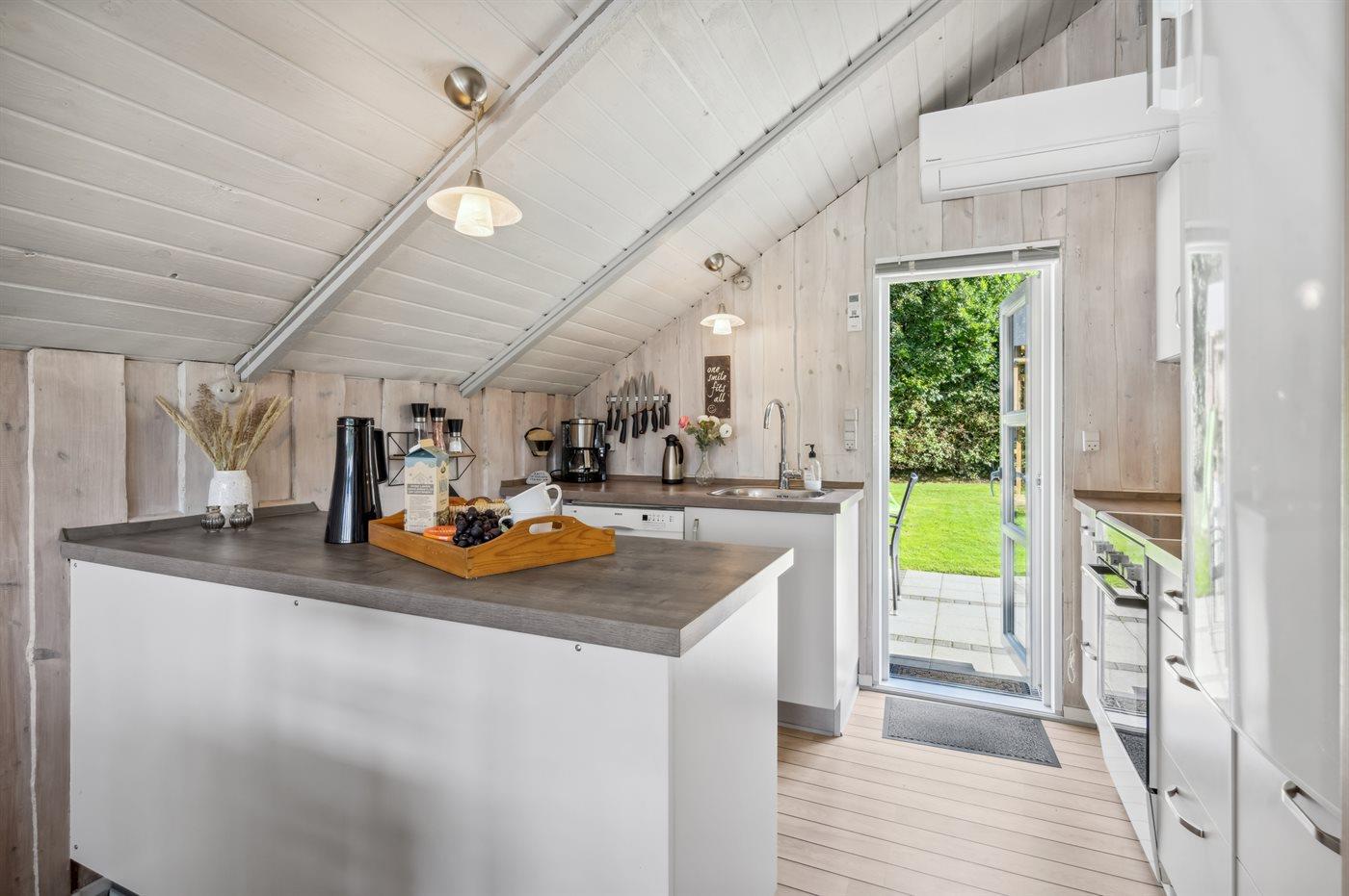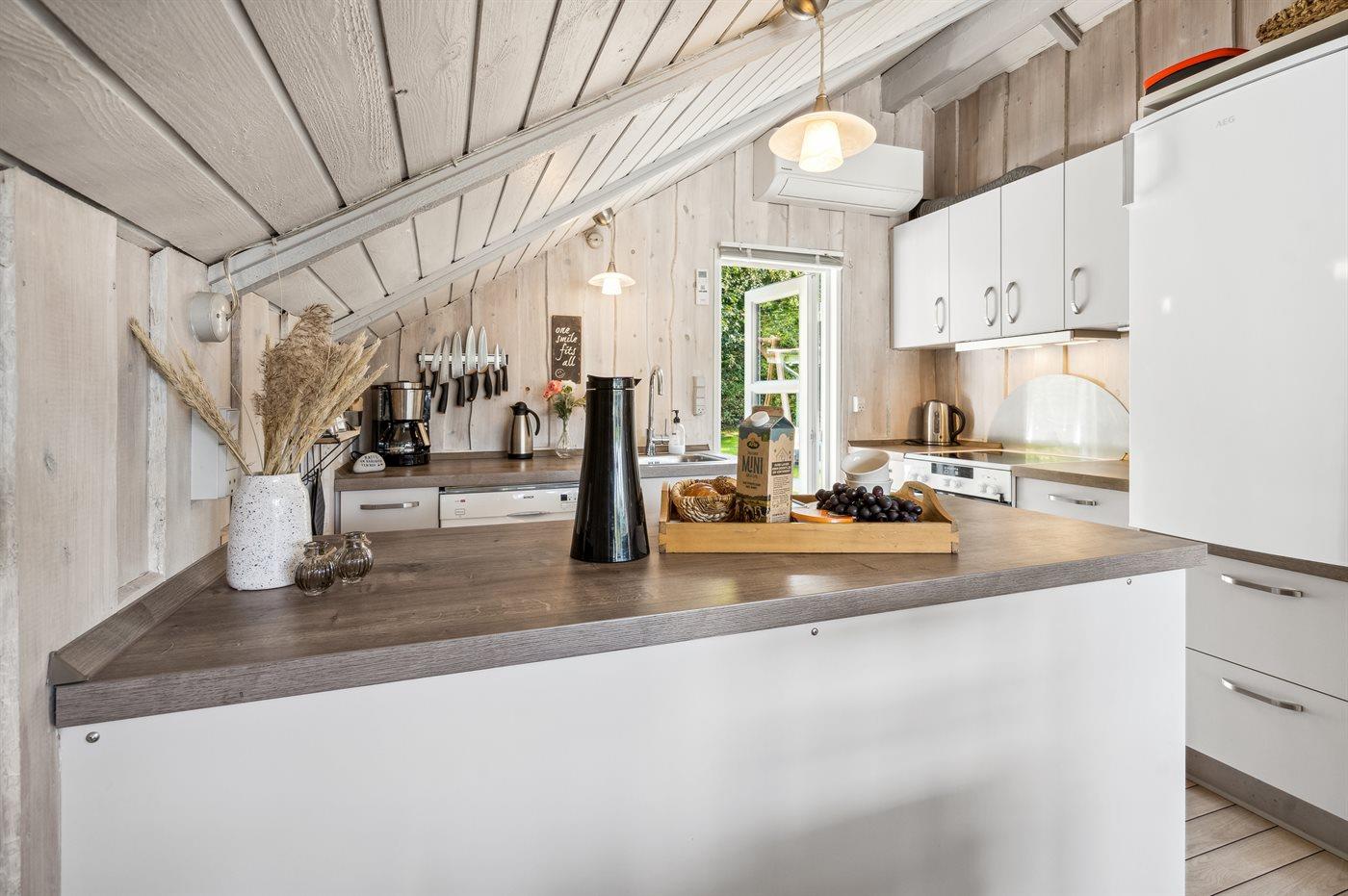 Køkkenet er udstyret med 1 køleskab. Der er 4 keramiske kogeplader, varmluftovn, mikrobølgeovn samt opvaskemaskine.