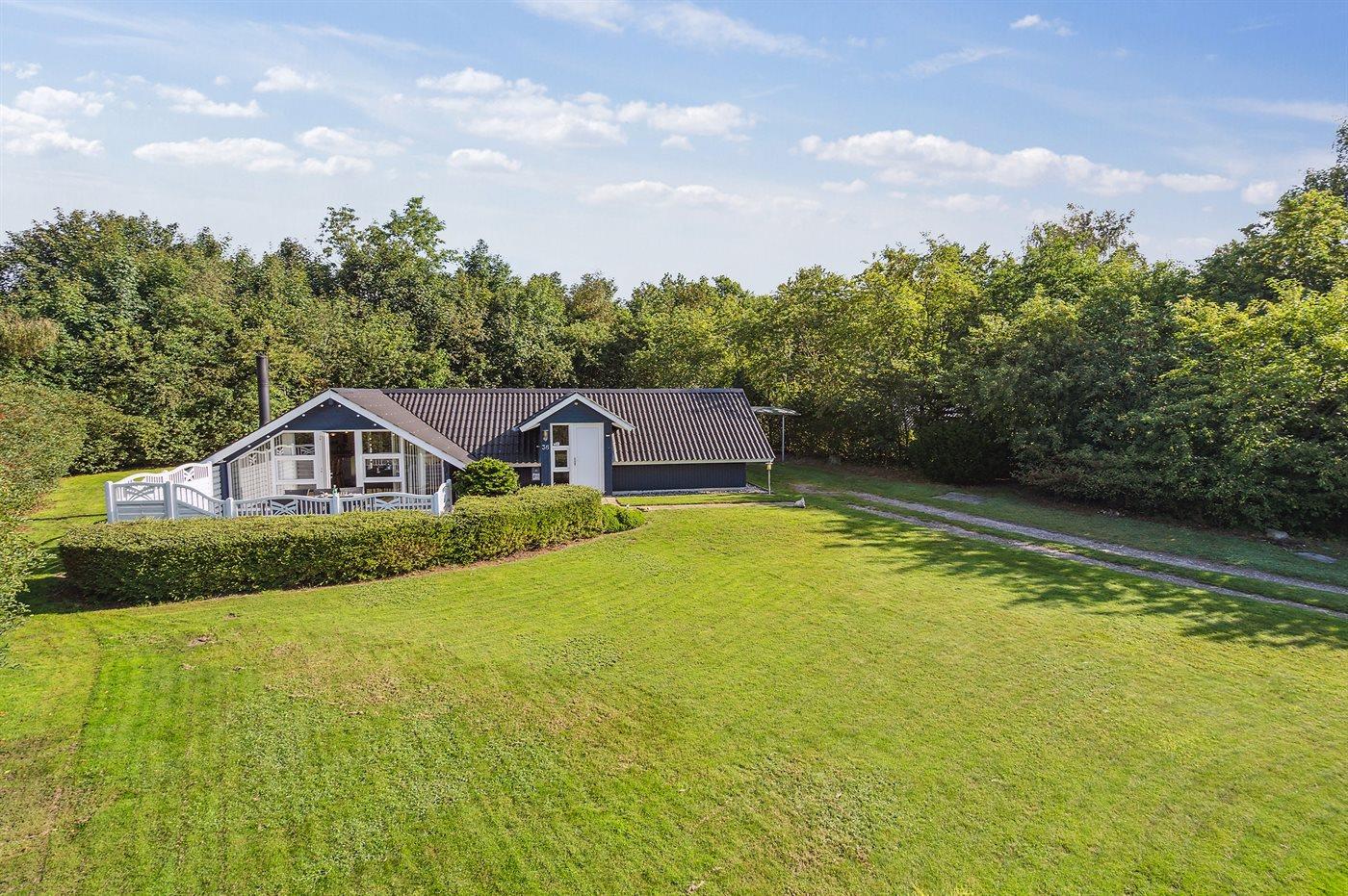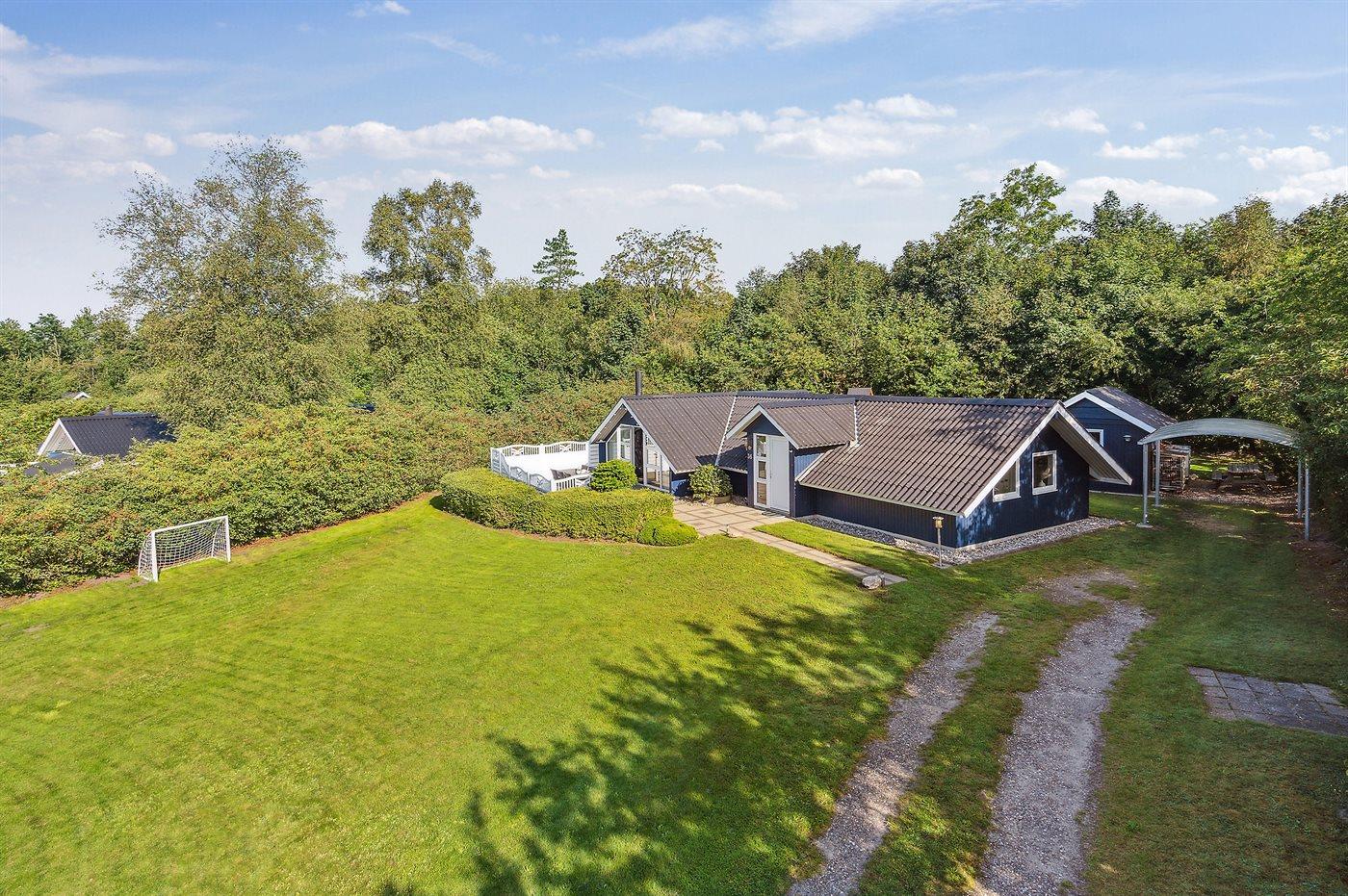 Dette rummelige og lyst indrettede sommerhus ligger på en dejlig grund med plads til boldspil og leg - ikke langt fra en fiskesø og indkøbsmuligheder.