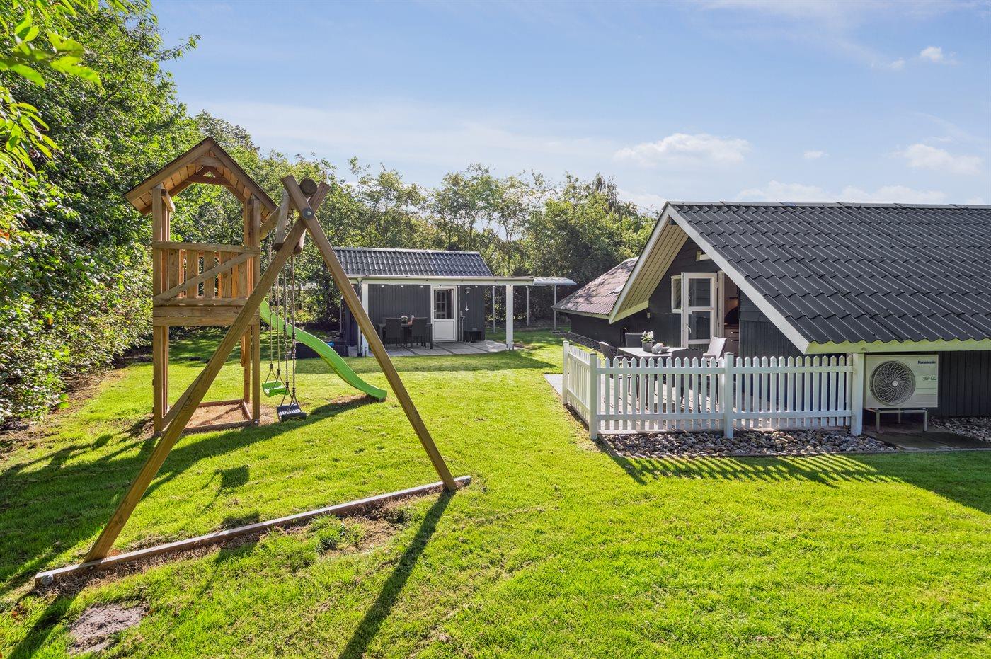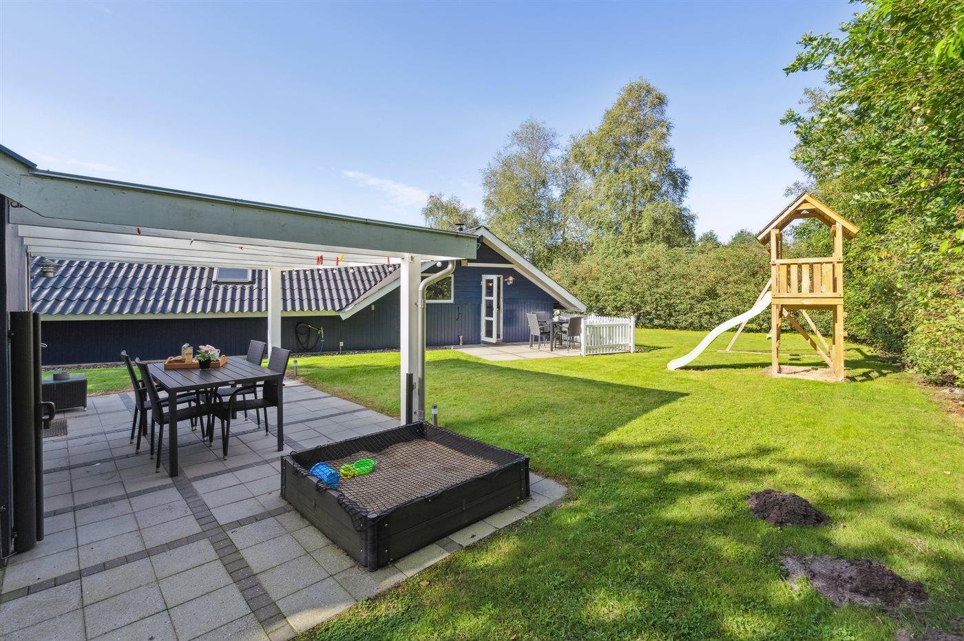 Rummeligt sommerhus nær fiskesø og butikker, med stor grund og moderne faciliteter.