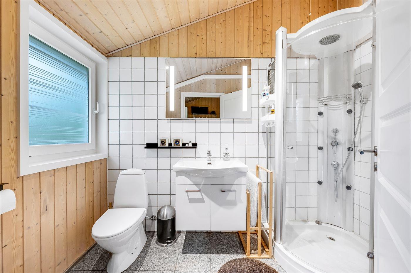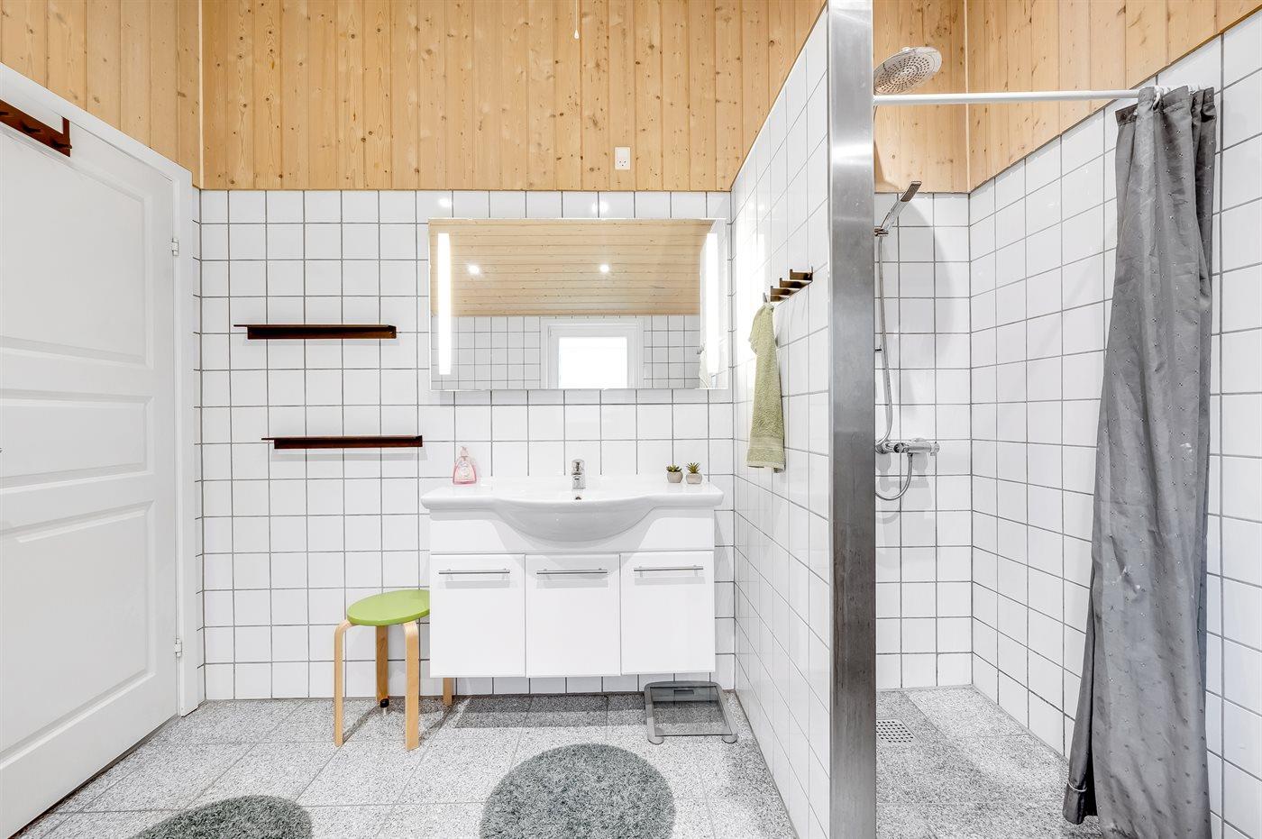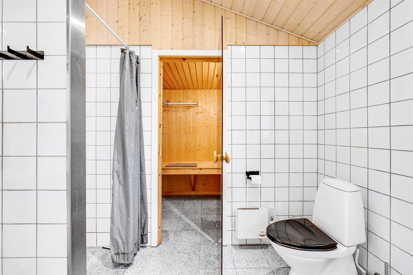 Der er 2 badeværelser med bruseniche og 2 toiletter. Der er gulvvarme på 2 badeværelser. I saunaen er der mulighed for afslapning.