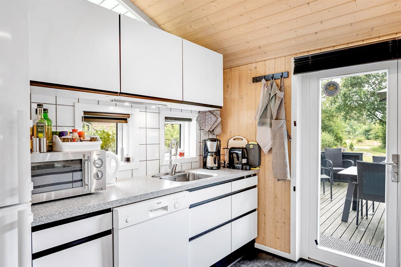 Køkkenet er udstyret med 1 køleskab. Der er 4 keramiske kogeplader, varmluftovn, mikrobølgeovn samt opvaskemaskine.