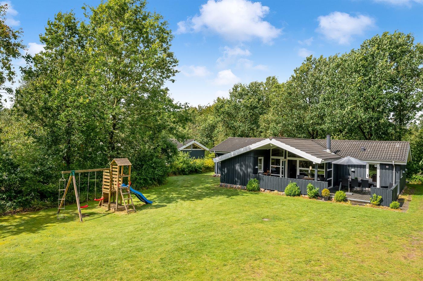 Ferieboligen er beliggende på en 877 m² stor naturgrund. Grunden er indhegnet med et lille hegn - 60 cm højt. Der er 25000 m til havet. Nærmeste forretning er beliggende i en afstand af 1000 m. Til ferieboligen hører 35 m² terrasseareal. Desuden er der 10 m² overdækket terrasse. Gynge. Sandkasse. Legetårn. Parkering ved ferieboligen.