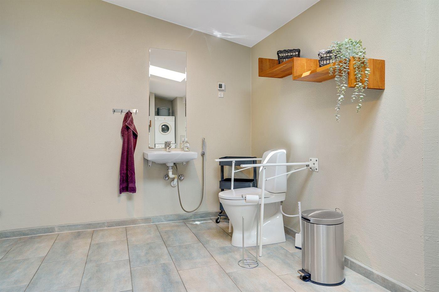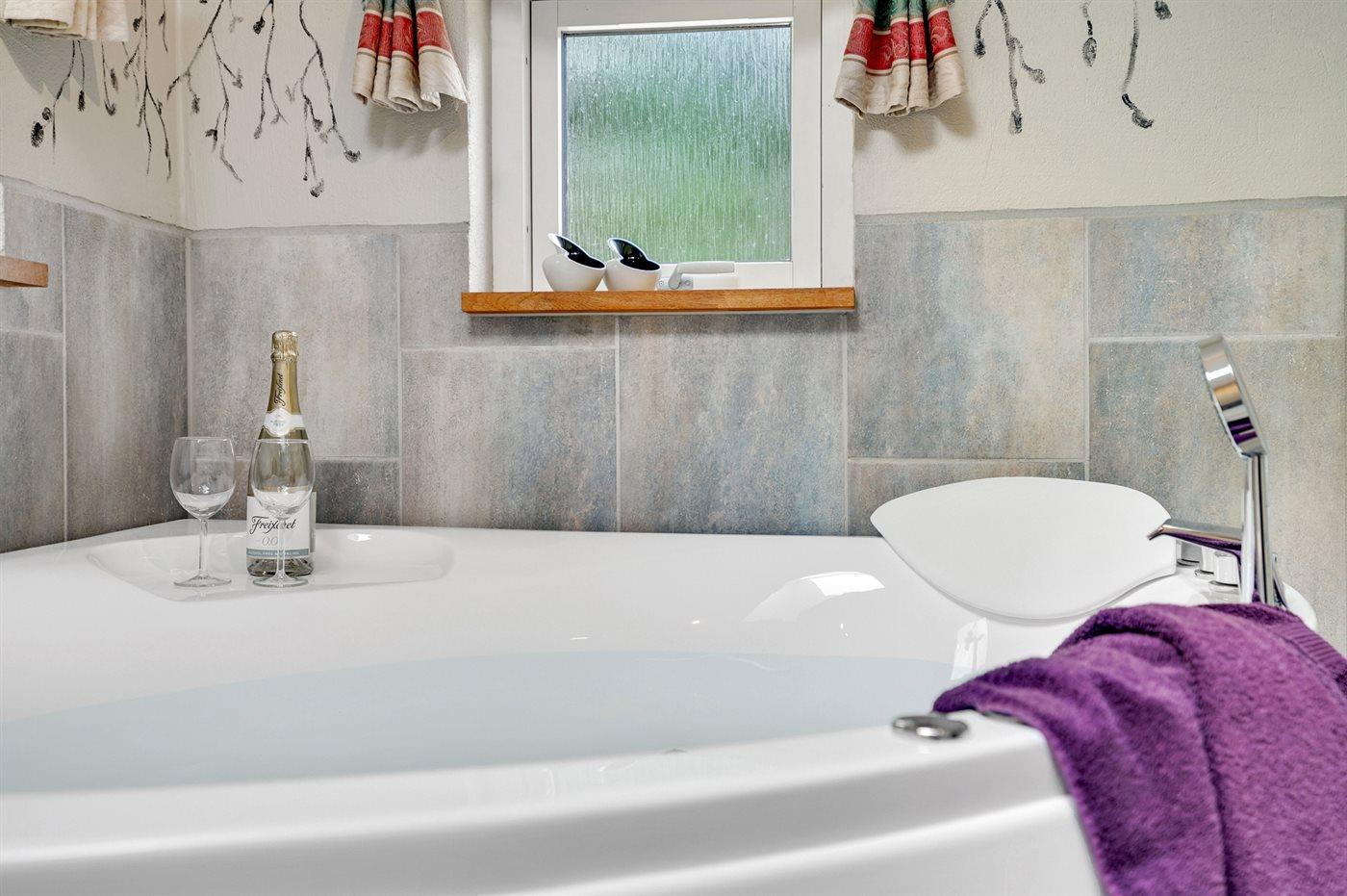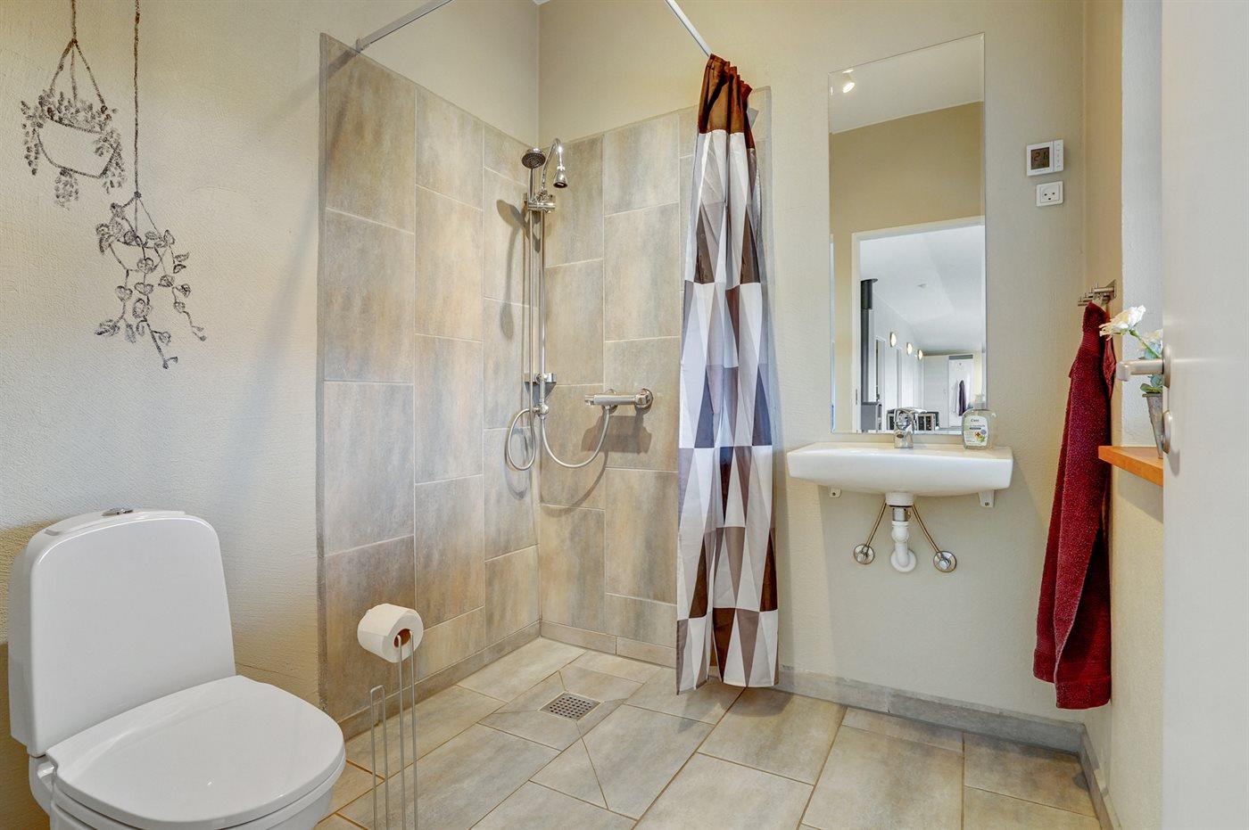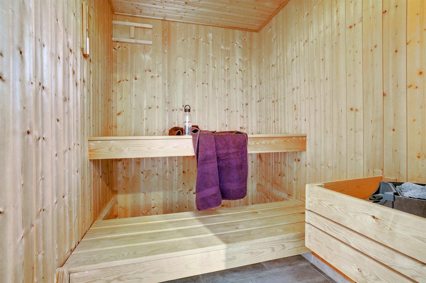 Der er 2 badeværelser med bruser og 2 toiletter. Brusebænk forefindes. Der er gulvvarme på 1 badeværelse. I saunaen er der mulighed for afslapning.