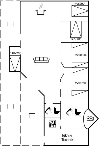 Der er i alt 5 soveværelser. Sovepladserne fordeler sig på: 6 sovepladser i dobbeltsenge. 4 sovepladser i enkeltsenge. Derudover er der 1 stk. barneseng.