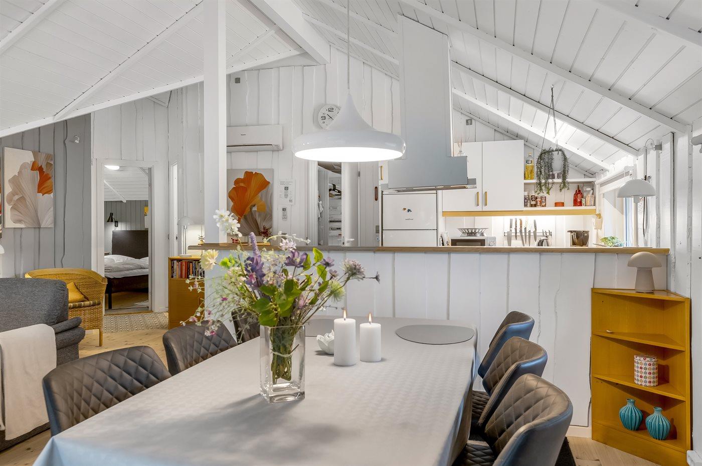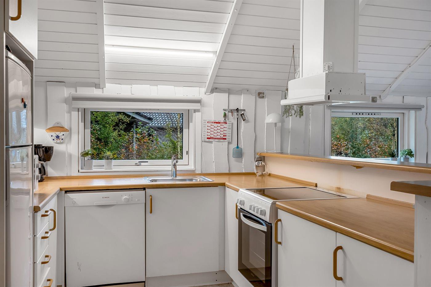 Køkkenet er udstyret med 1 køleskab. Der er 4 elkogeplader, varmluftovn, mikrobølgeovn samt opvaskemaskine.