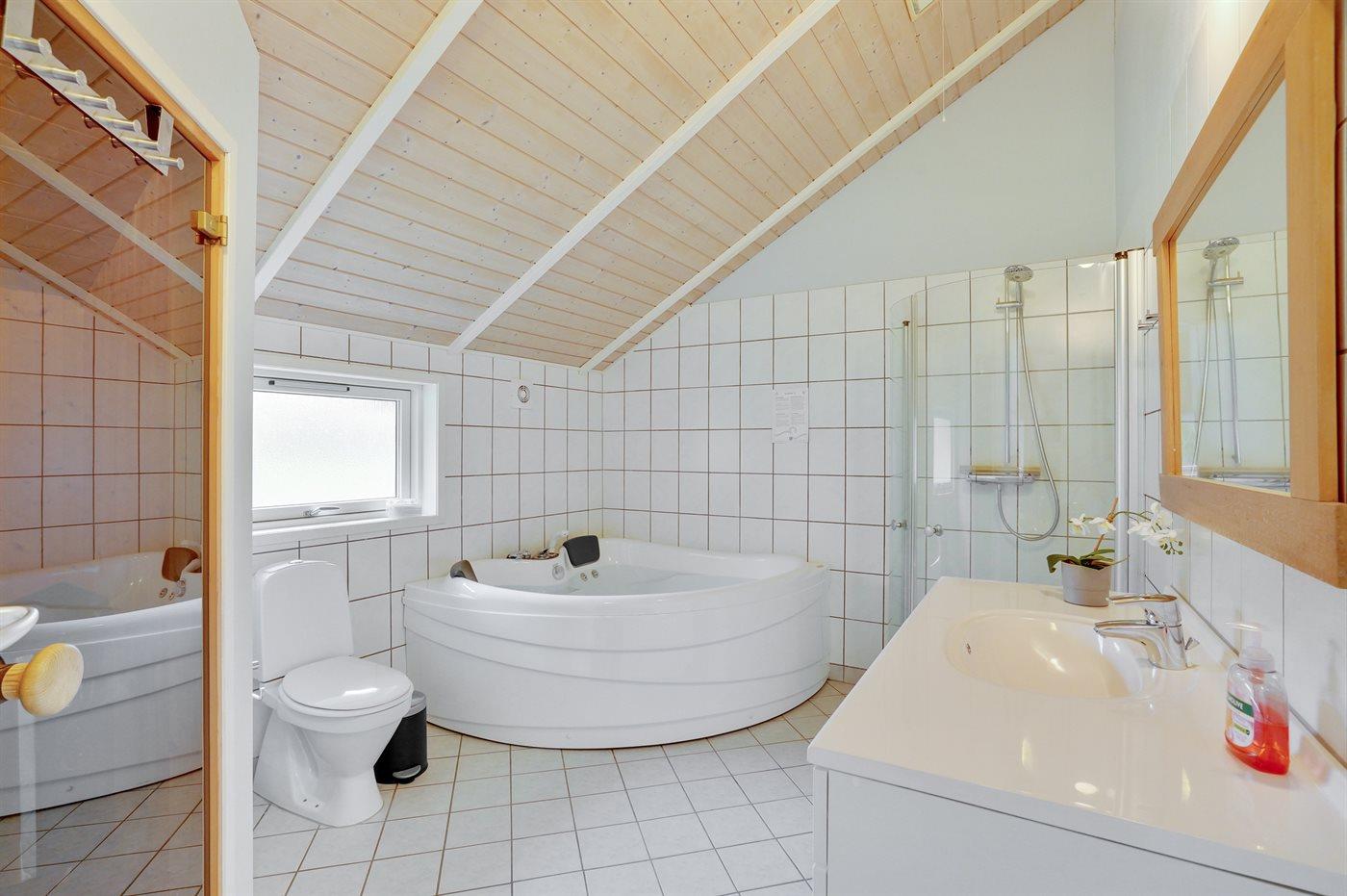 Der er 1 badeværelse med bruseniche og 2 toiletter, heraf 1 gæstetoilet. Der er gulvvarme på 1 badeværelse. I saunaen er der mulighed for afslapning.