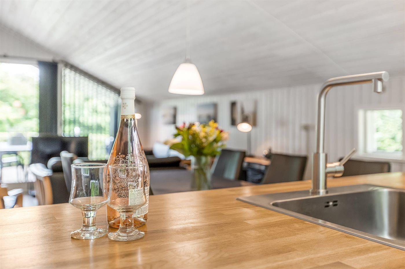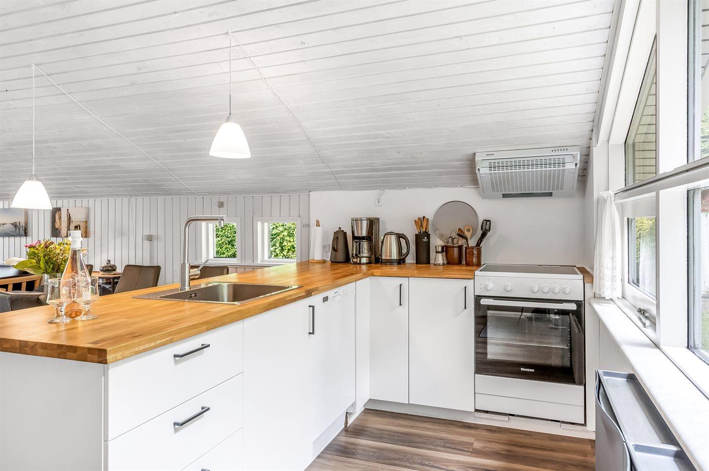 Køkkenet er udstyret med 1 køleskab. Der er 4 elkogeplader, varmluftovn, mikrobølgeovn samt opvaskemaskine.