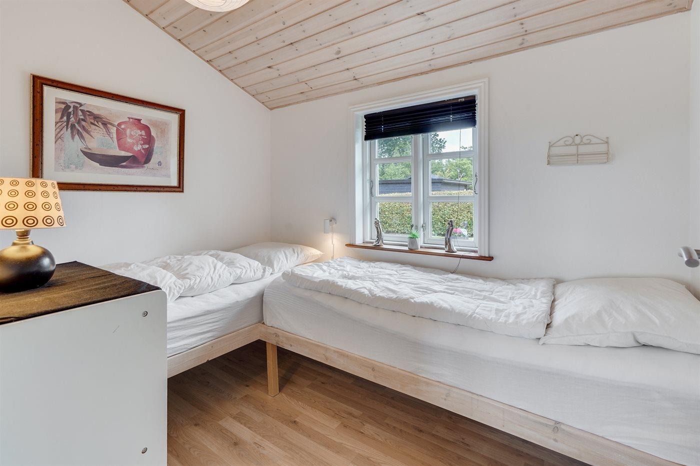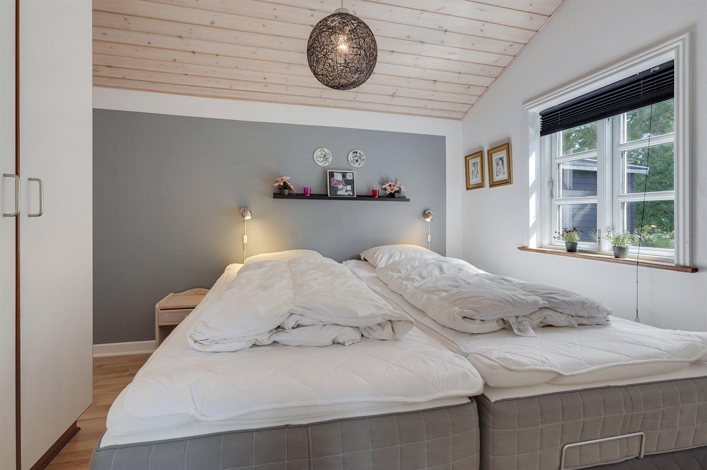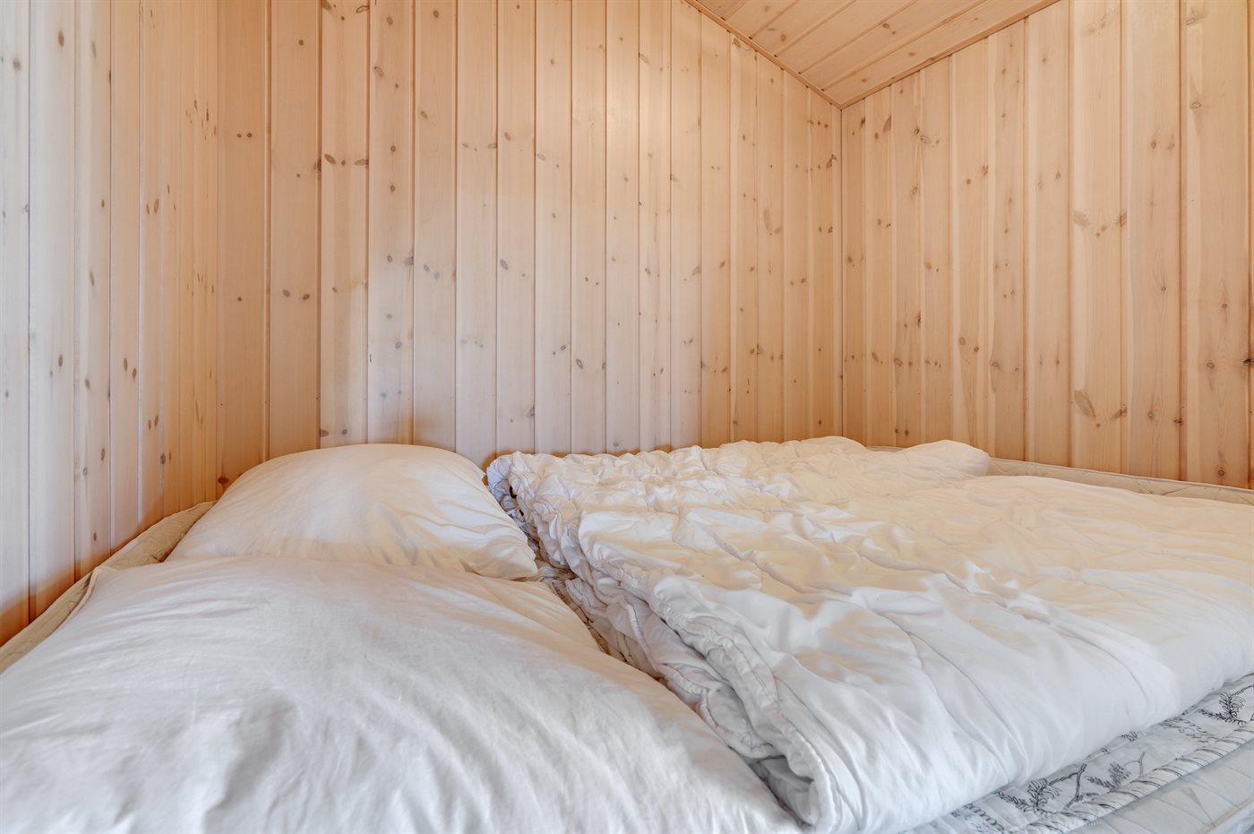 Der er i alt 2 soveværelser. Sovepladserne fordeler sig på: 2 sovepladser i enkeltsenge.2 sovepladser i elevationssenge. 2 sovepladser i alkove. Derudover er der 1 stk. barneseng.