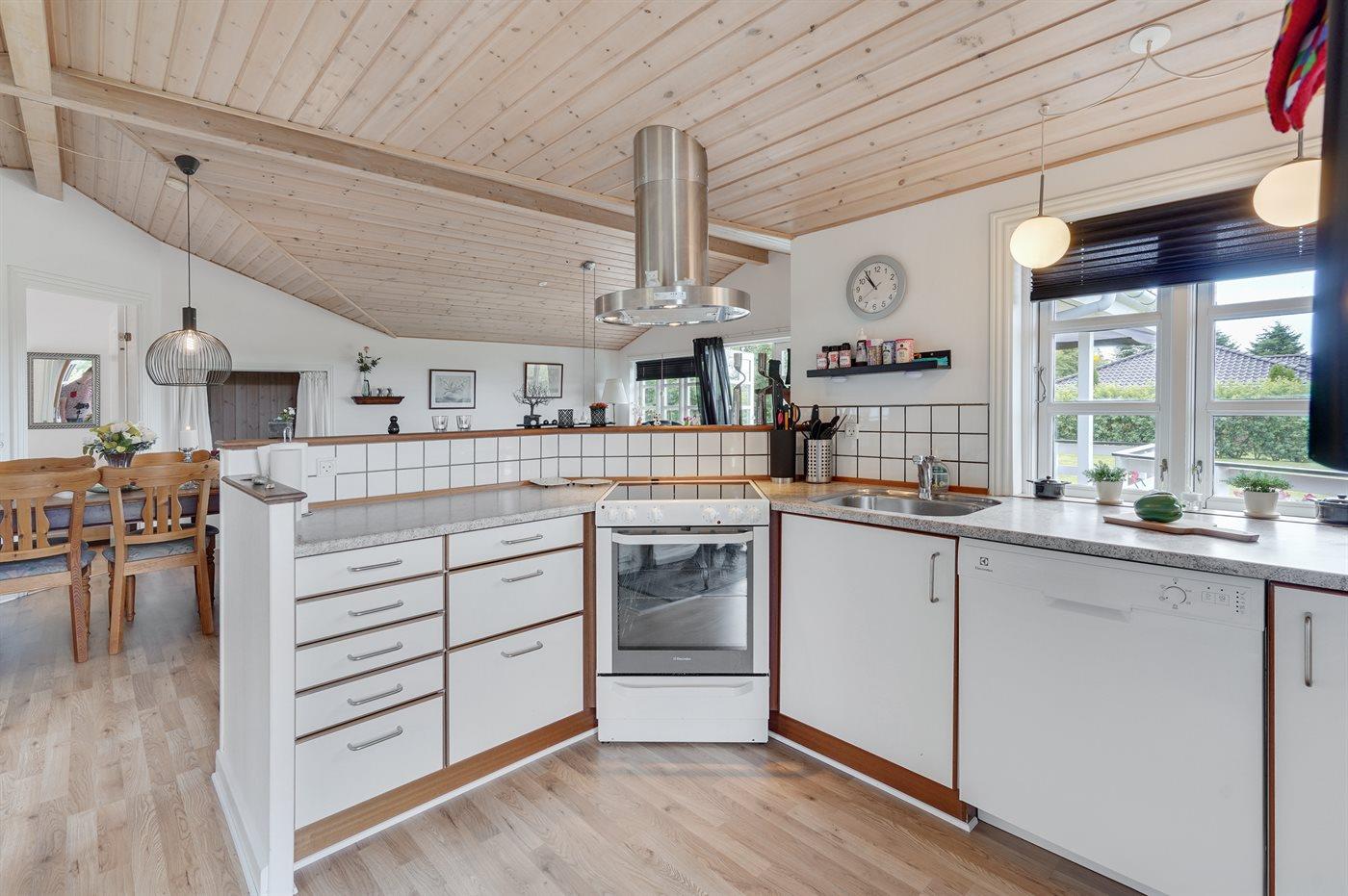 Køkkenet er udstyret med 1 køleskab. Der er 4 keramiske kogeplader, bageovn, varmluftovn, mikrobølgeovn, Airfryer samt opvaskemaskine.