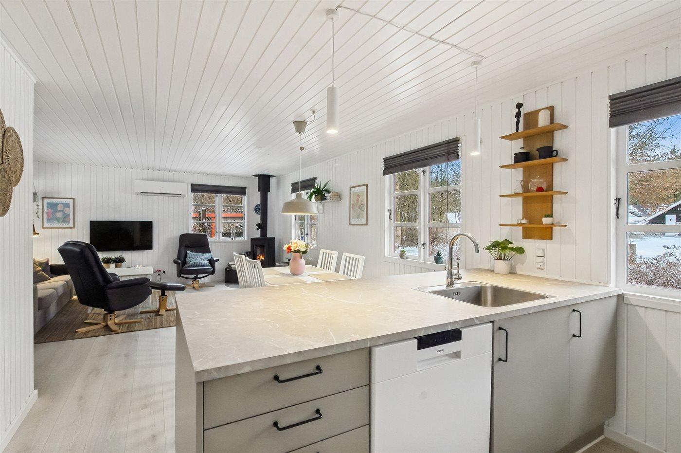 Køkkenet er udstyret med 1 køleskab. Der er 4 induktionskogeplader, bageovn, mikrobølgeovn samt opvaskemaskine.