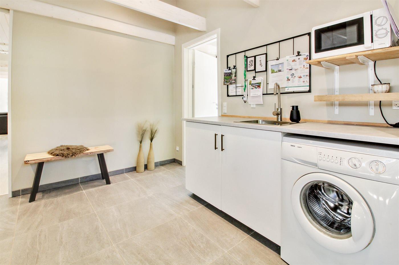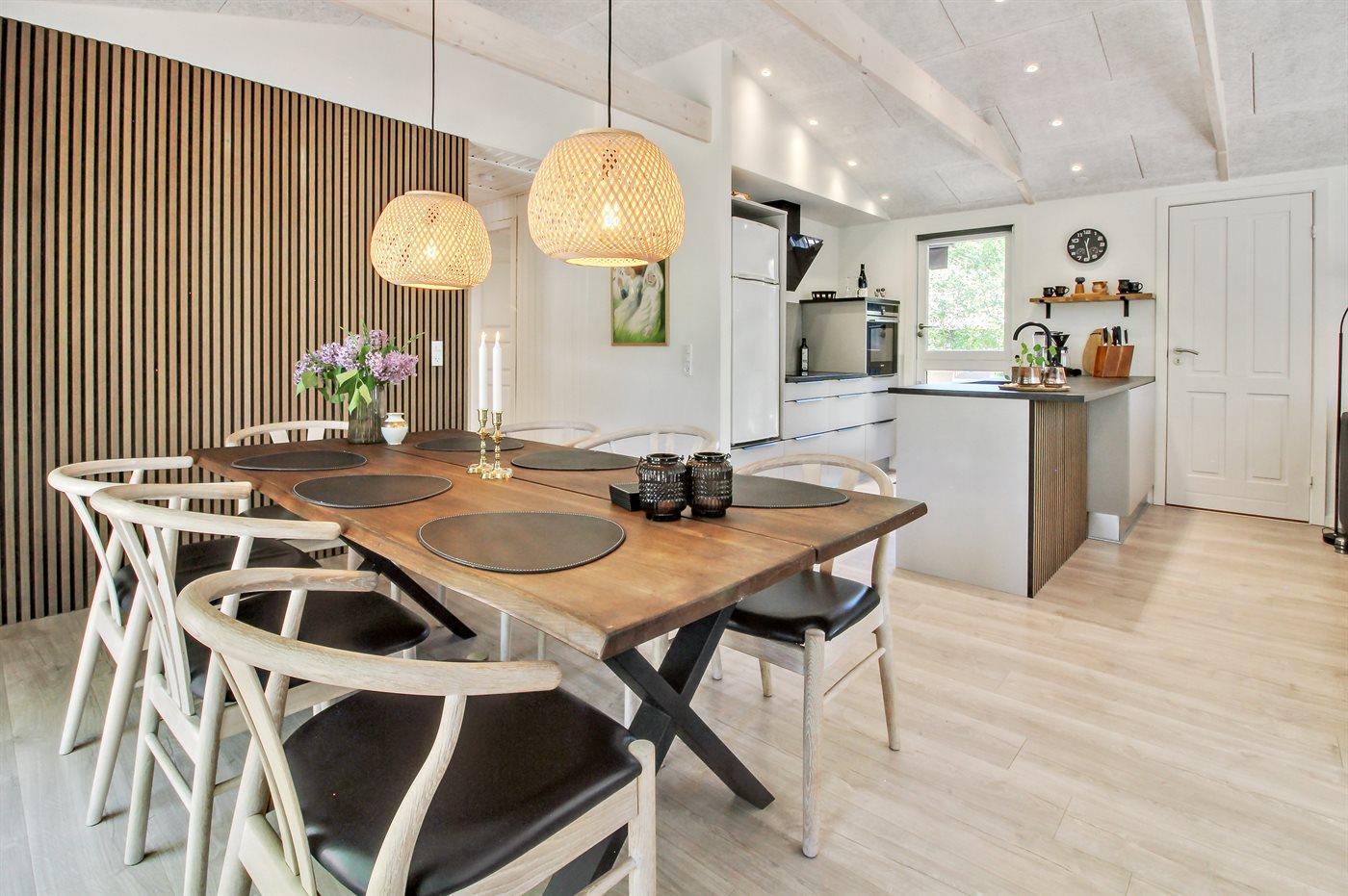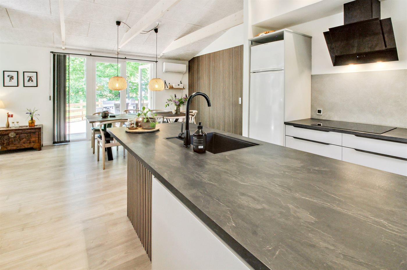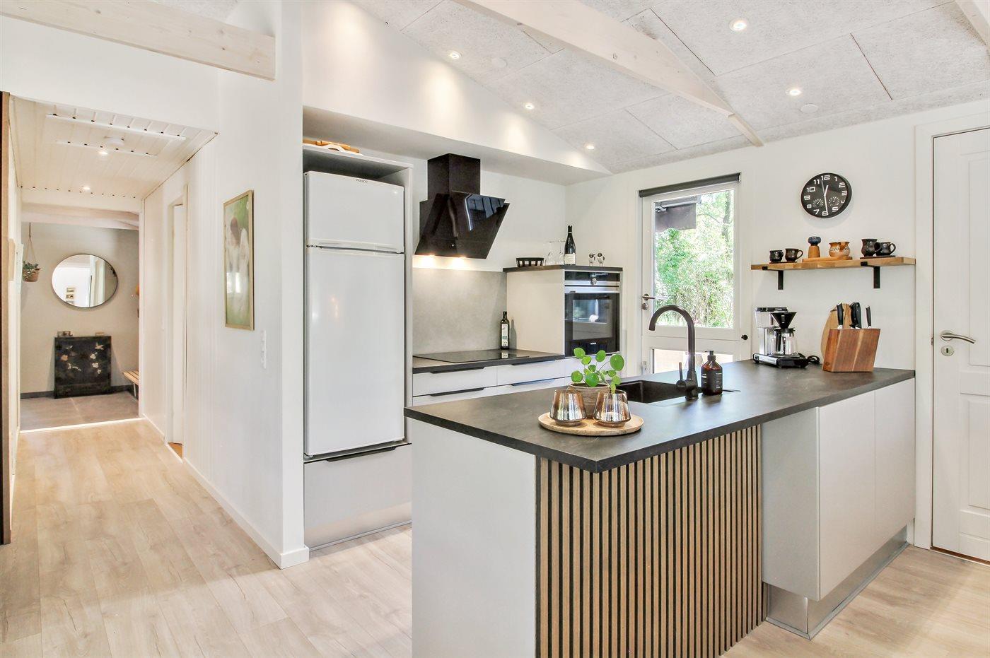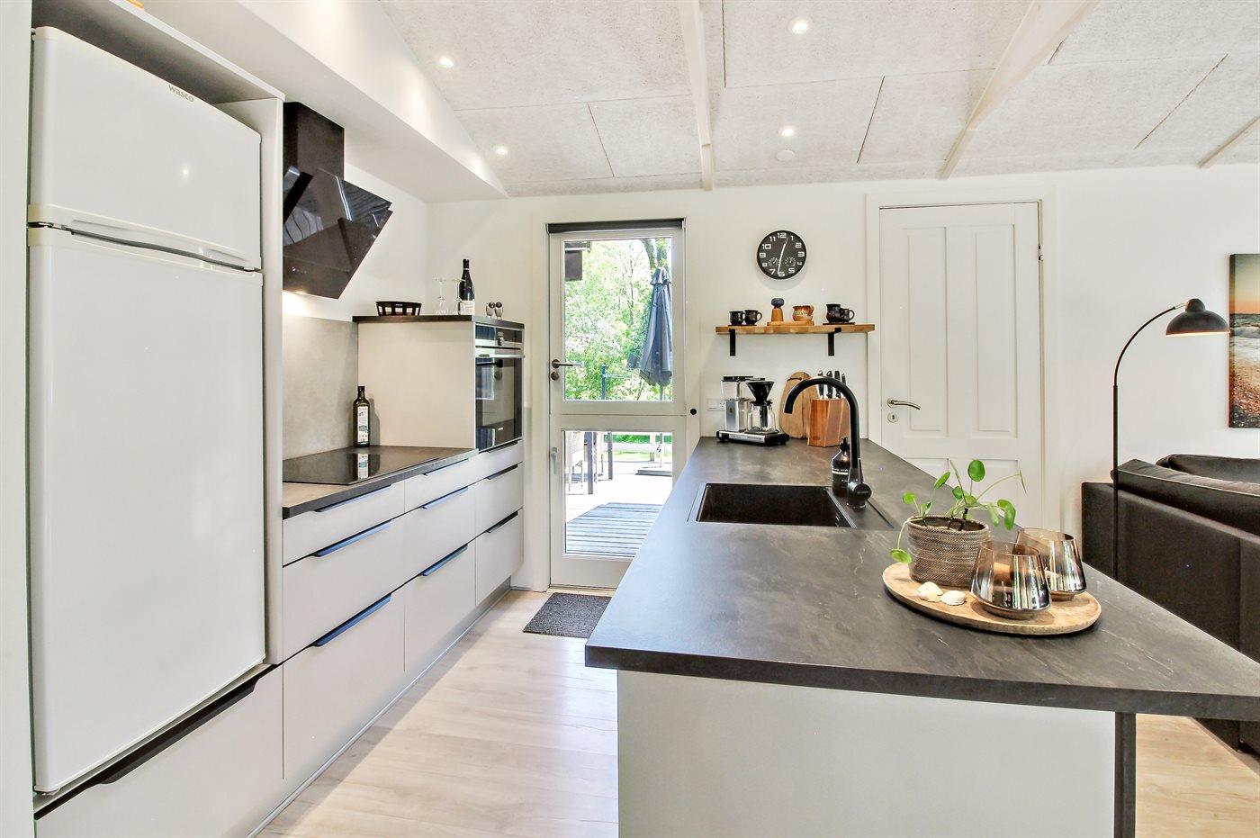 Køkkenet er udstyret med 1 køleskab. Der er 4 induktionskogeplader, varmluftovn, mikrobølgeovn samt opvaskemaskine.