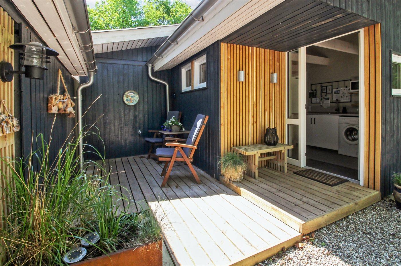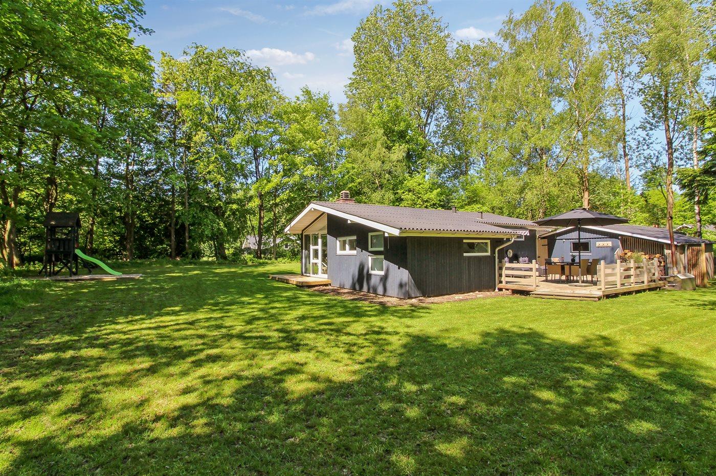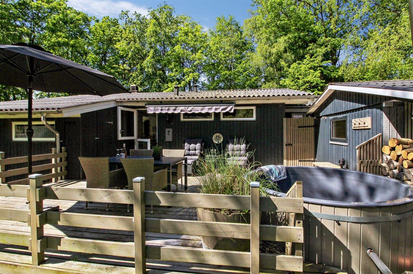 Sommerhuset ligger på en dejlig grund med plads til boldspil og leg. Fra køkken/alrummet er der udgang til husets terrasser, både mod øst og vest, så I kan flytte jer med solen i løbet af dagen. På terrassen finder I også husets brændeopvarmede vildmarkskar, hvor I ved aftenstide kan nyde et varmt bad under stjernernes skær.