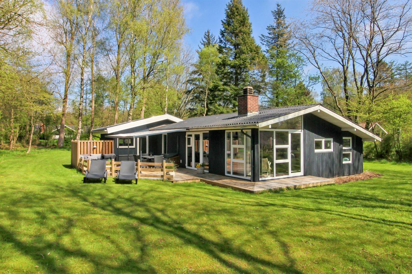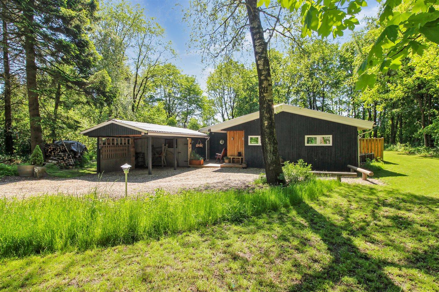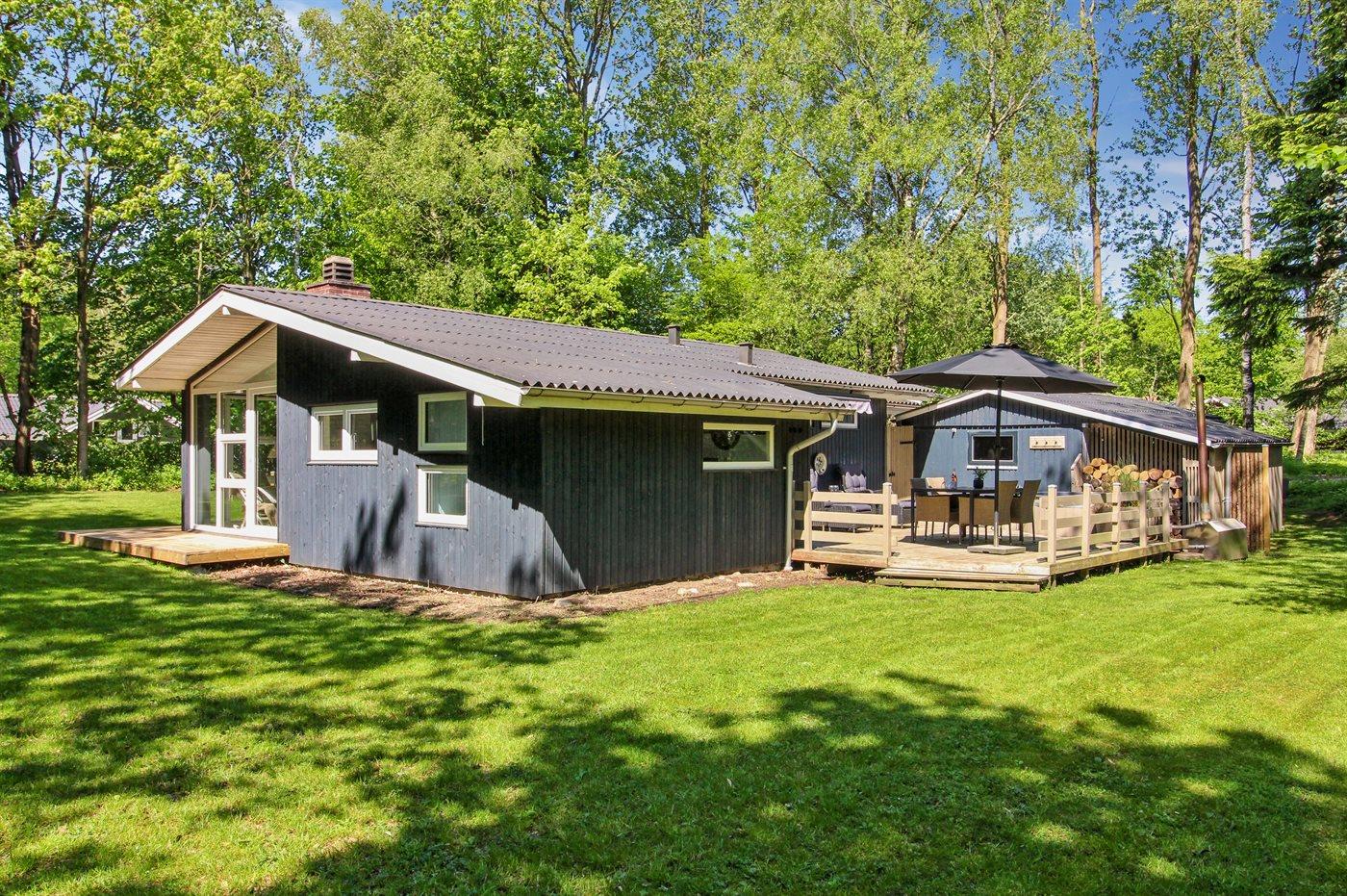 Sommerhuset ligger på en dejlig grund med plads til boldspil og leg. Fra køkken/alrummet er der udgang til husets terrasser, både mod øst og vest, så I kan flytte jer med solen i løbet af dagen. På terrassen finder I også husets brændeopvarmede vildmarkskar, hvor I ved aftenstide kan nyde et varmt bad under stjernernes skær.