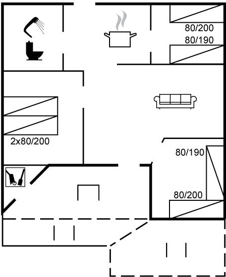 Der er i alt 3 soveværelser. Sovepladserne fordeler sig på: 2 sovepladser i dobbeltseng. 4 sovepladser i enkeltsenge. Derudover er der 1 stk. barneseng.