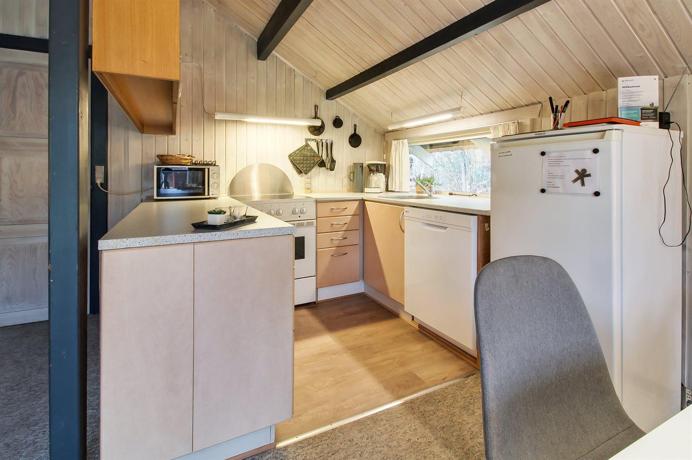 Køkkenet er udstyret med 1 køleskab. Der er 4 keramiske kogeplader, varmluftovn, mikrobølgeovn samt opvaskemaskine.
