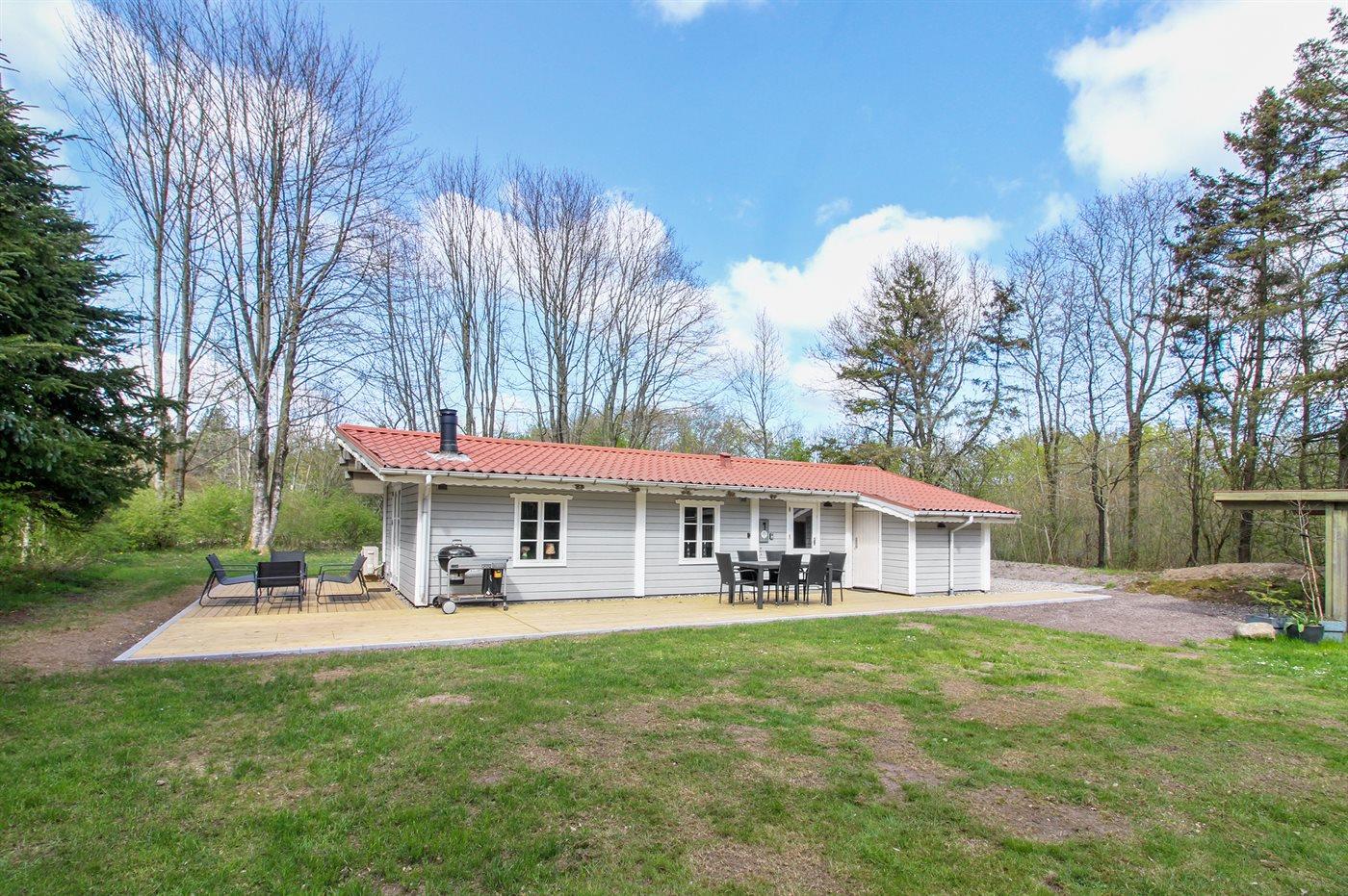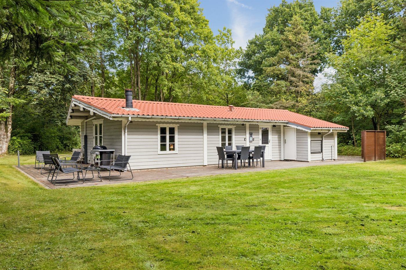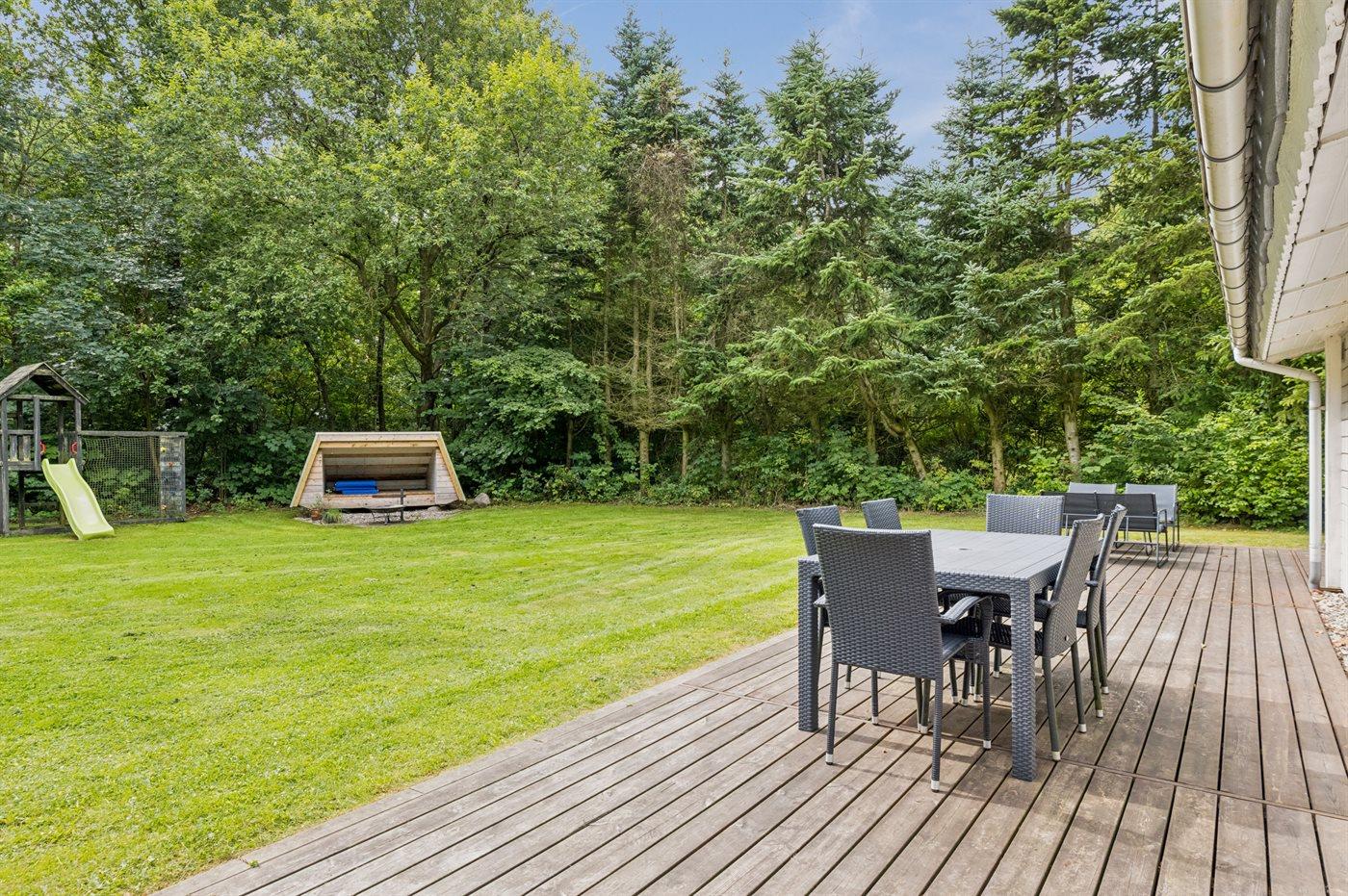 Huset ligger på en 875 m² stor naturgrund og har en stor træterrasse, der vender mod syd og vest. I haven finder man shelter samt bålfad med en stor rist, hvor man kan tilberede sin mad eller lave snobrød. Der er også en grill til rådighed.