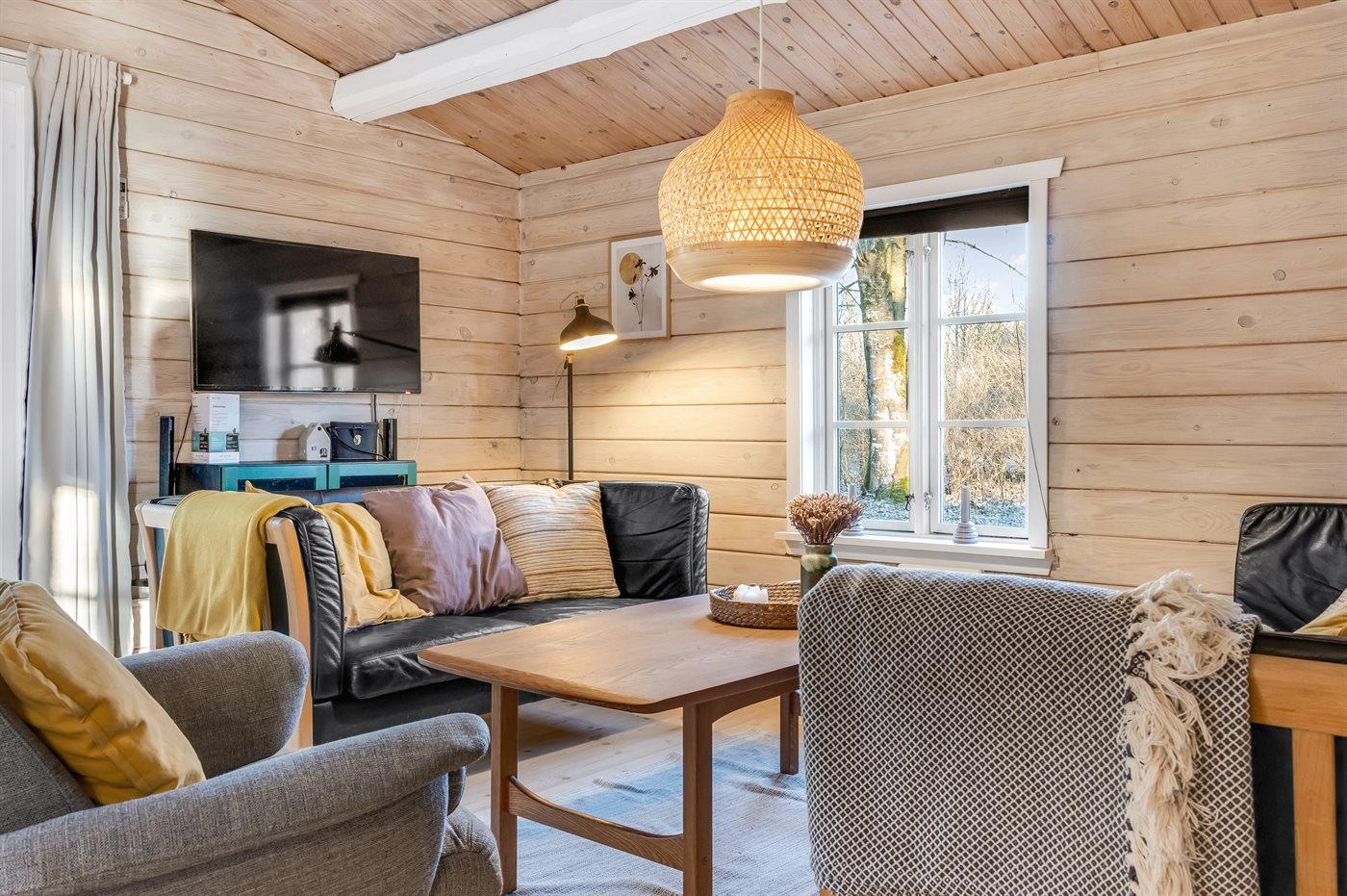 I stuen er der et nyt TV med indbygget google TV samt TV-pakke fra Norlys med lidt danske, norske og tyske kanaler. Endvidere kan man streame fra sine egne personlige konti via sin mobil.