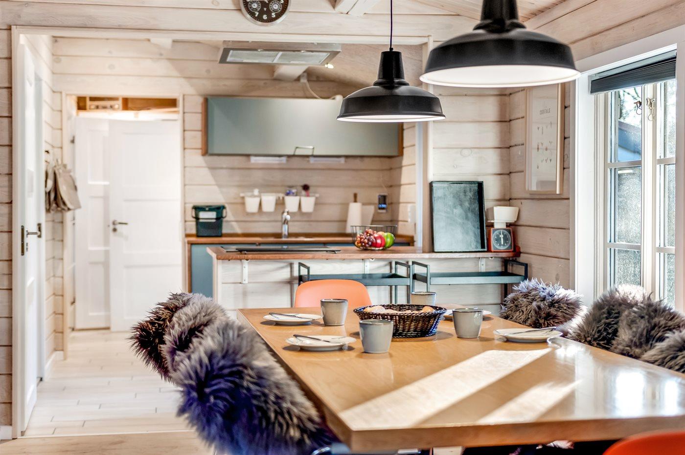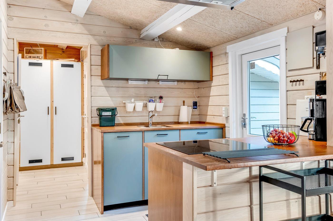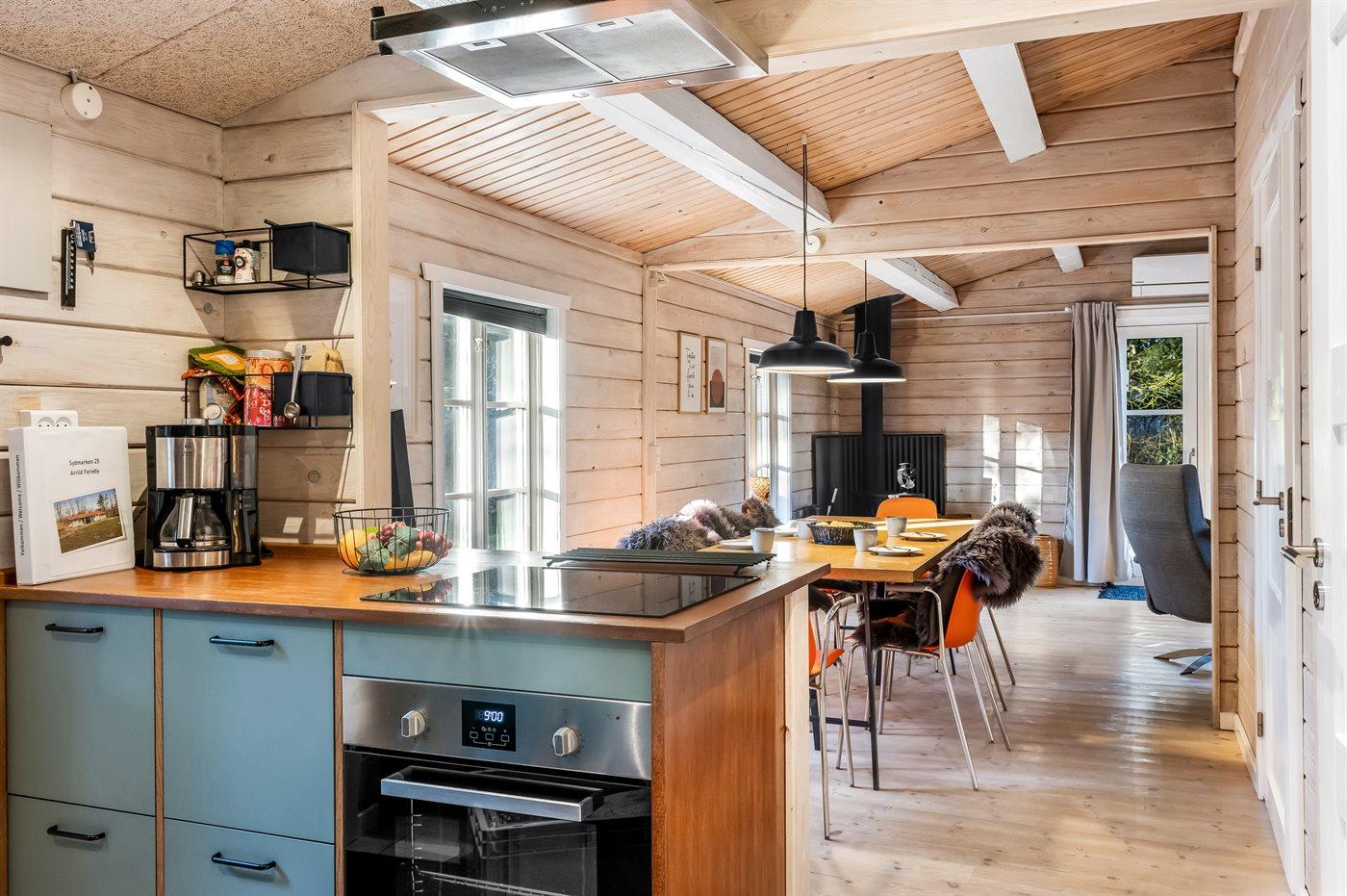Køkkenet er udstyret med køleskab, 4 induktionskogeplader, varmluftovn, mikrobølgeovn og opvaskemaskine.