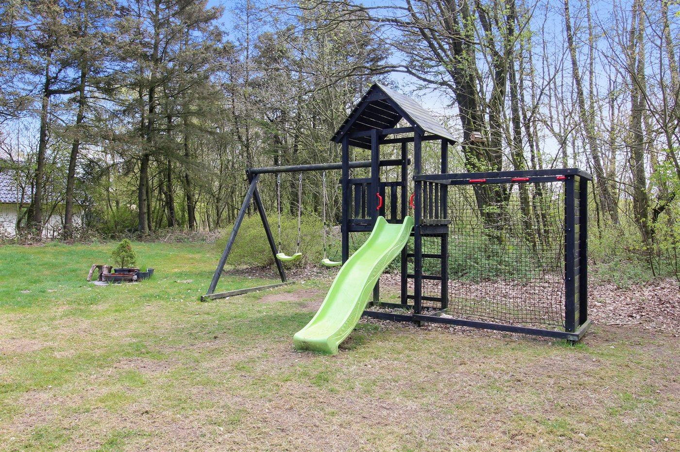I haven er der også gynger samt rutchebane og legetårn til de mindste feriegæster. Der er parkering ved huset.