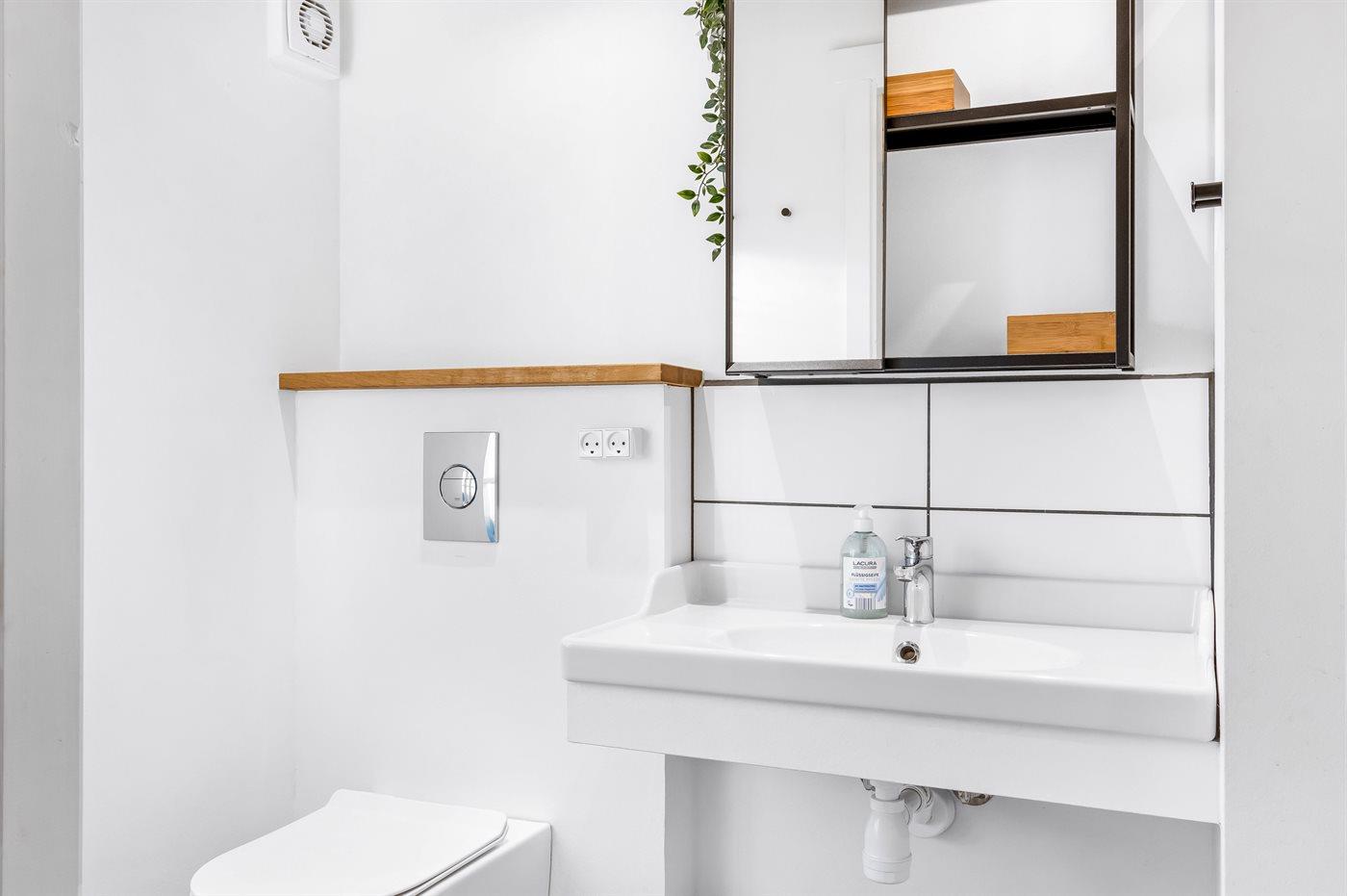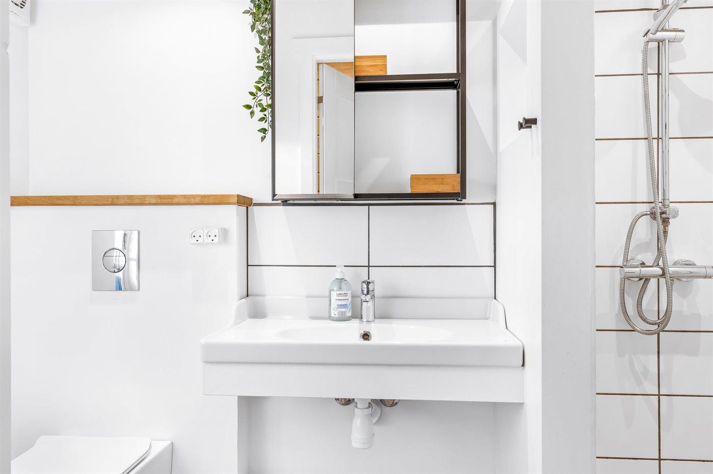Der findes et nyrenoveret badeværelse med bruseniche og toilet.