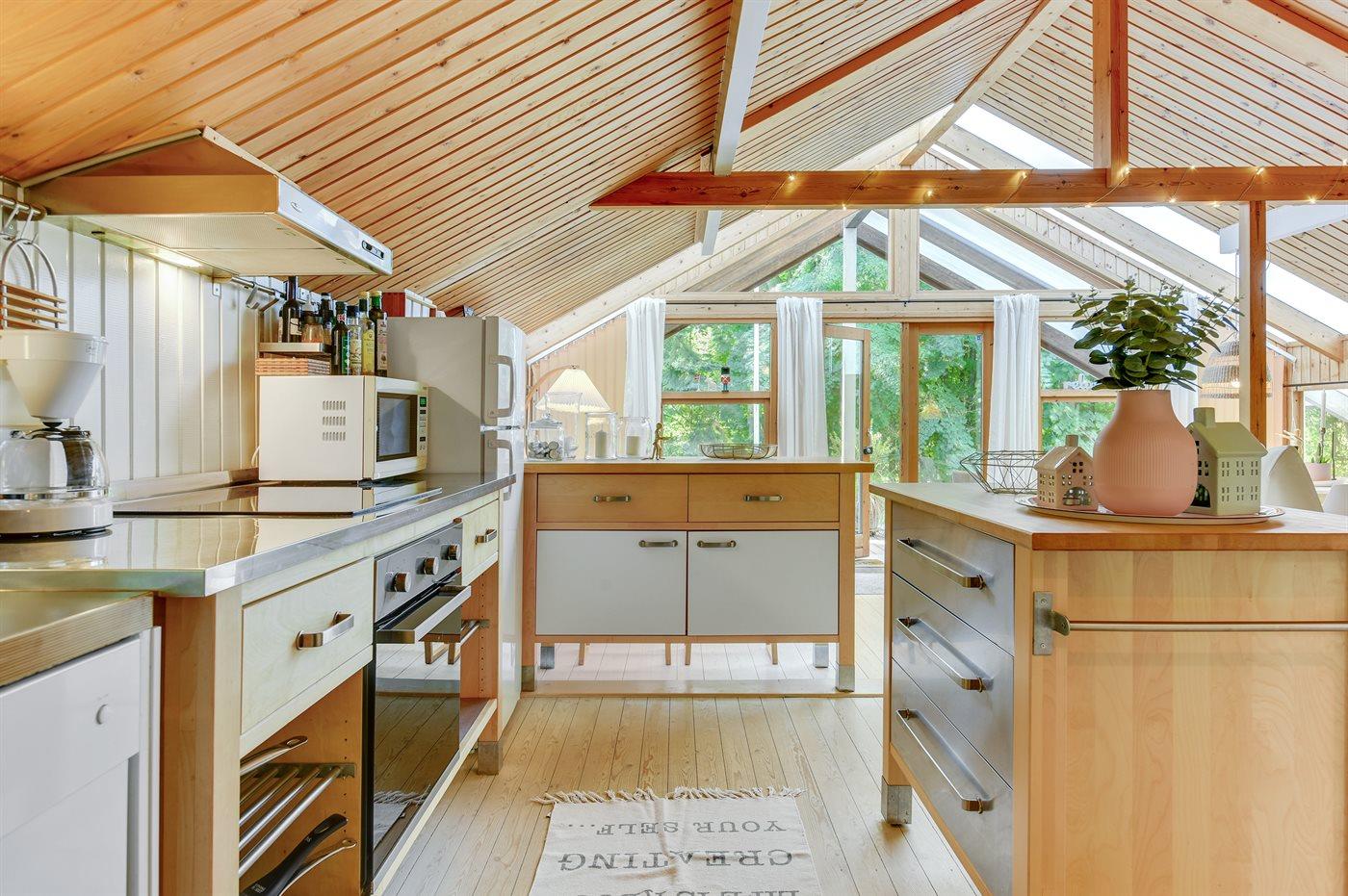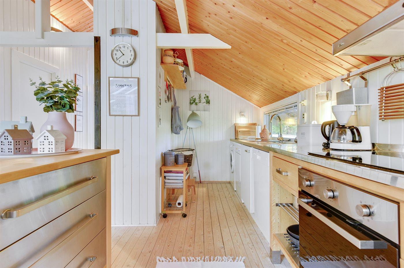 Køkkenet er udstyret med 1 køleskab. Der er 4 keramiske kogeplader, miniovn, varmluftovn samt opvaskemaskine.