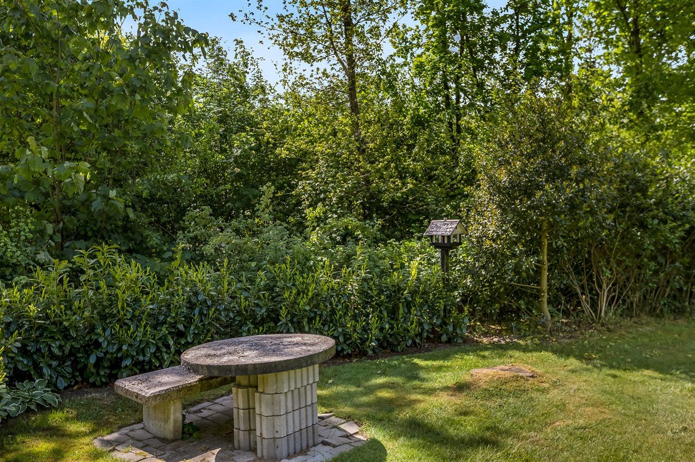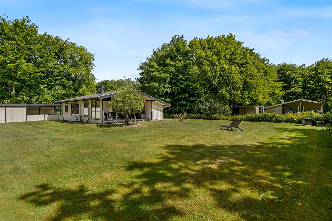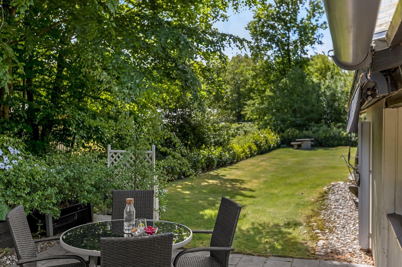 Fra stuen er der udgang til en overdækket terrasse mod syd, hvorfra man kan nyde udsigten over den store have, hvor der er plads til boldspil og leg. Mod øst findes der endnu en terrasse hvor I kan nyde jeres morgenkaffe. Haven er indhegnet så der er styr på små børn og mindre hunde.