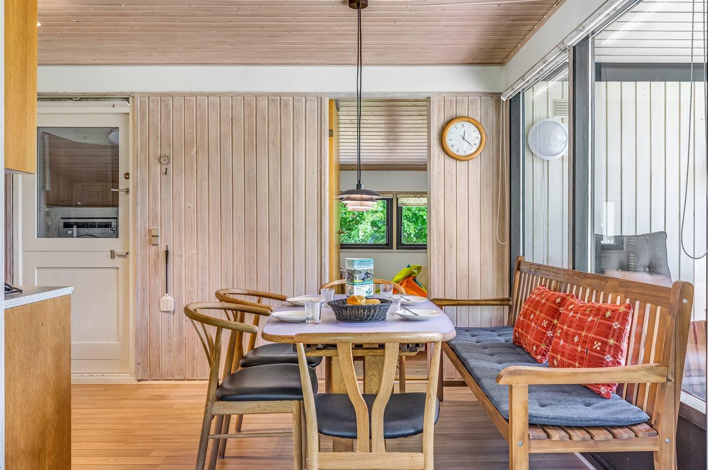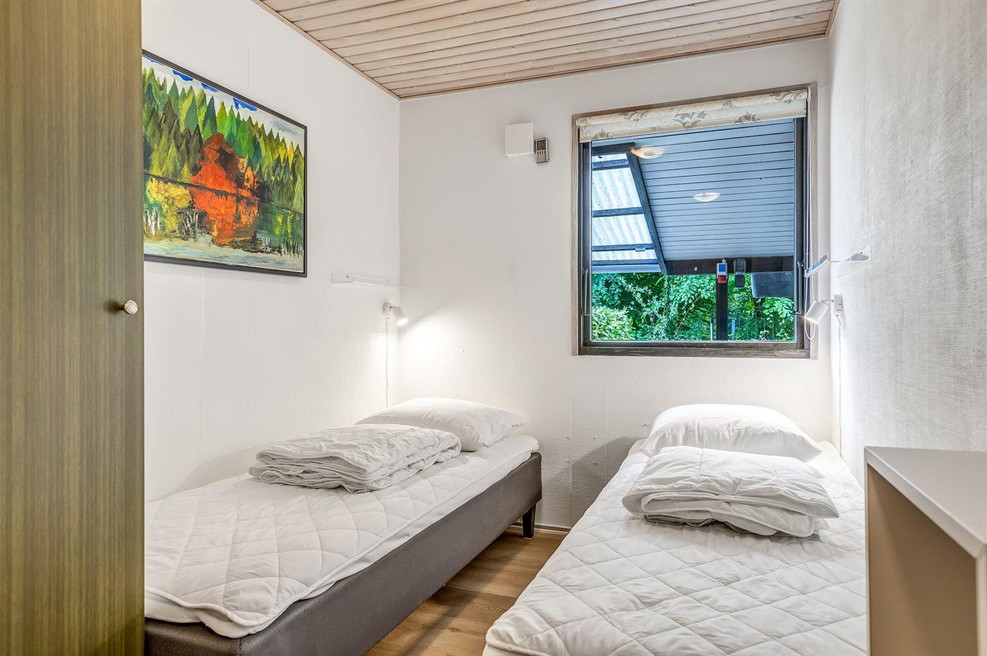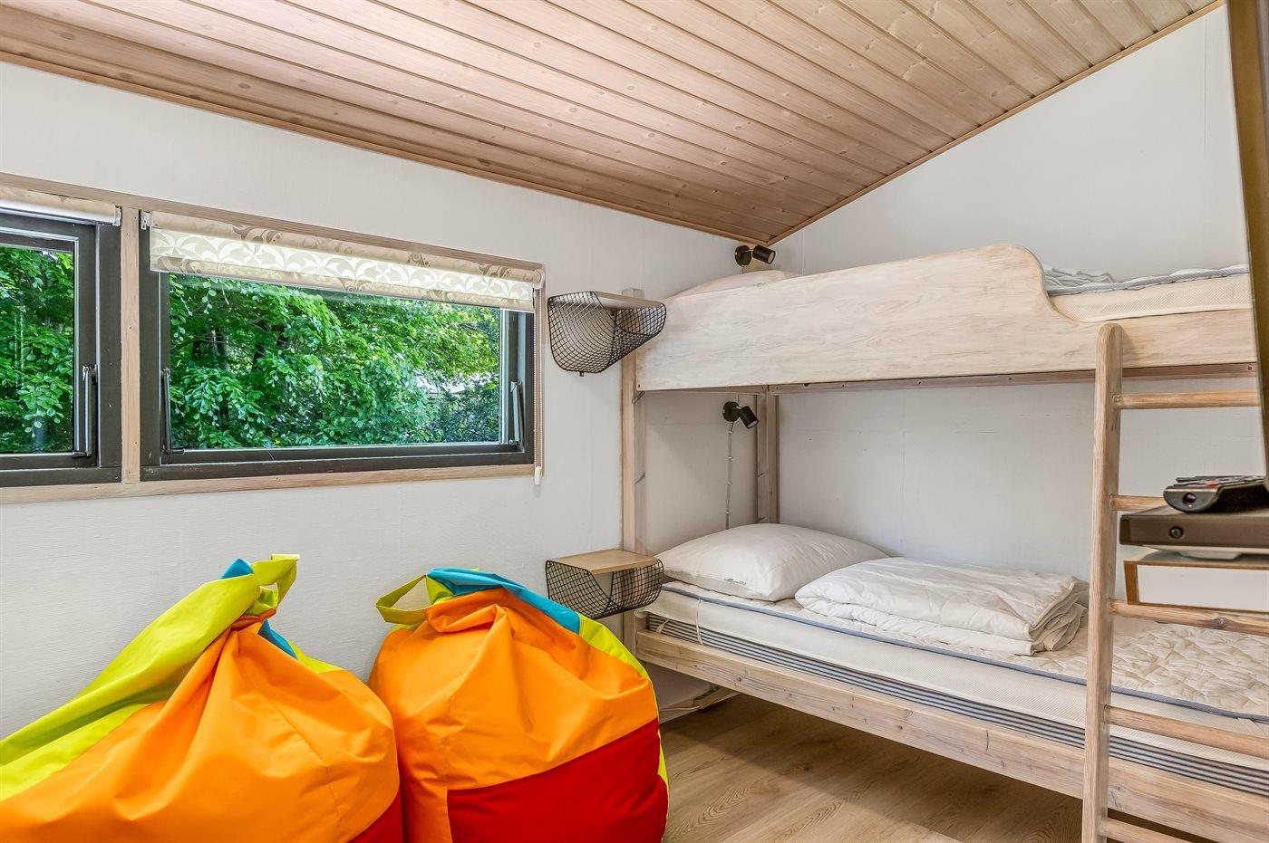 Der findes køkken/alrum med brændeovn, badeværelse med bruseniche og gulvvarme samt tre soveværelser med henholdsvis to enkeltsenge, dobbelt elevationsseng og to sovepladser i køjeseng (kun egnet til større børn (4-11 år). Der er TV i stuen samt i soveværelset med køjeseng, hvor der også er en DVD-afspiller.