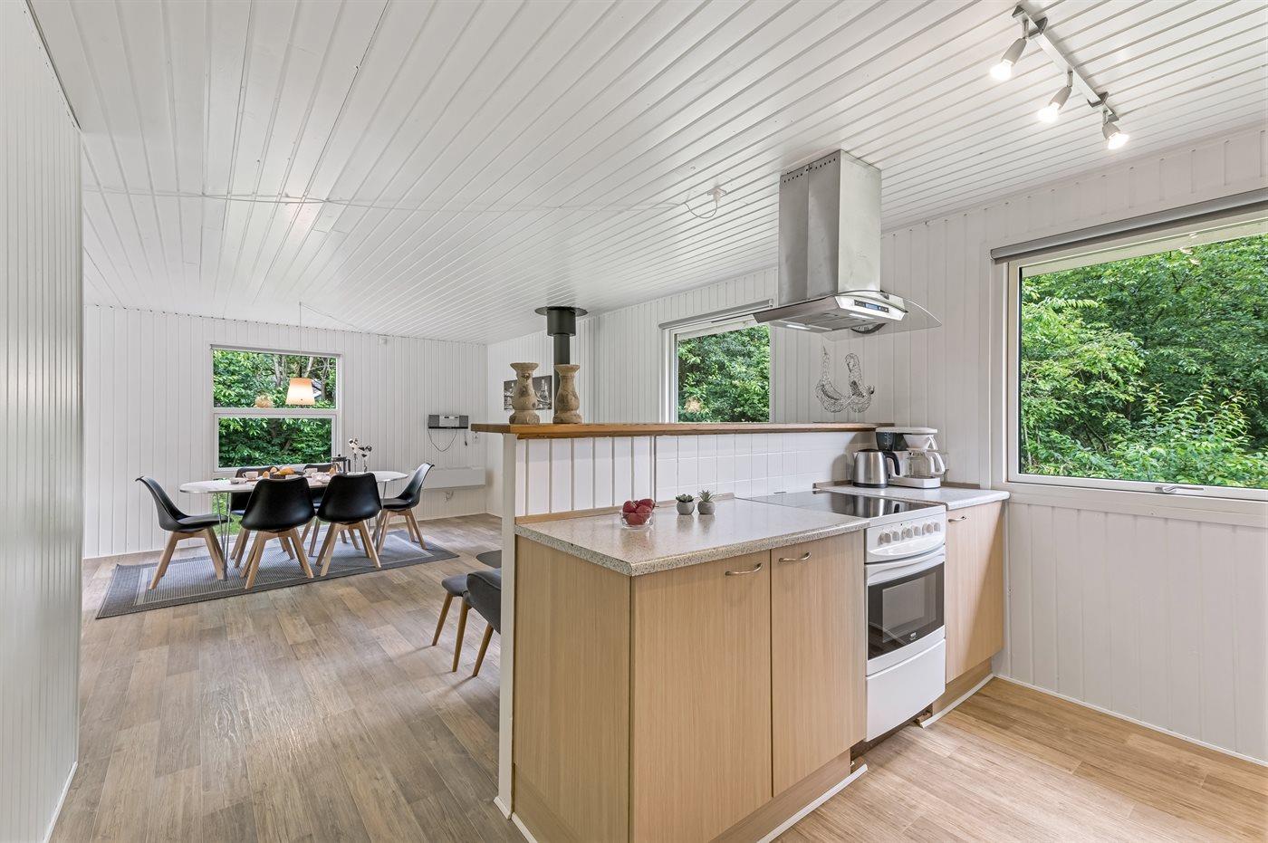 Køkkenet er udstyret med 1 køleskab. Der er 4 keramiske kogeplader, varmluftovn, mikrobølgeovn samt opvaskemaskine.