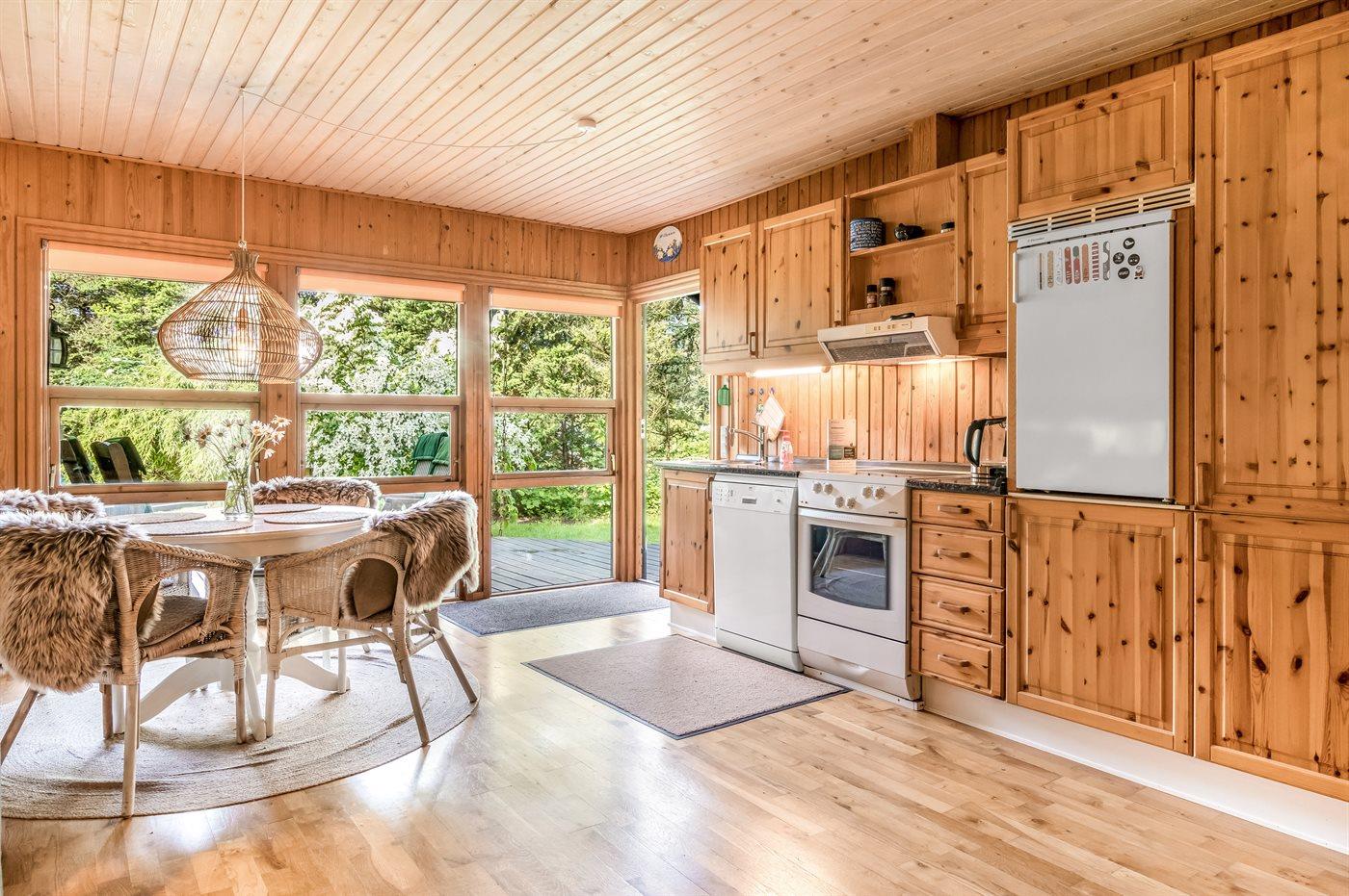 Køkkenet er udstyret med 1 køleskab. Der er 4 keramiske kogeplader, varmluftovn, mikrobølgeovn, Airfryer samt opvaskemaskine.