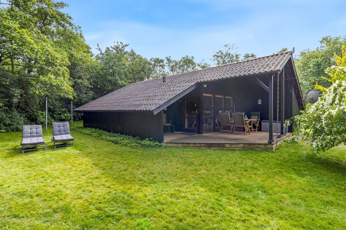 Hyggeligt sommerhus midt i skoven med indhegnet have og sauna for afslapning.