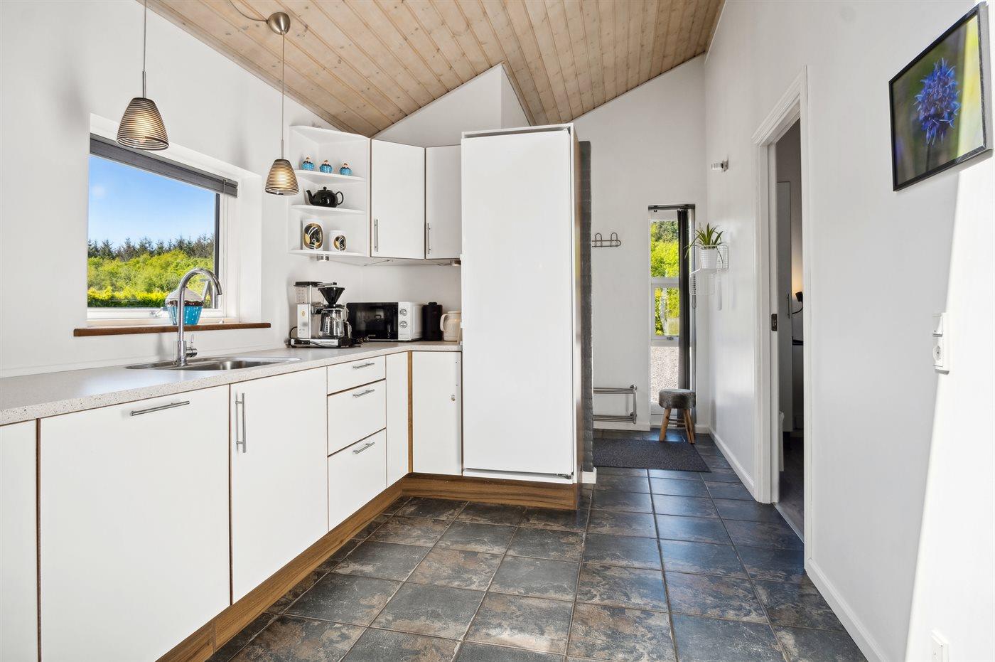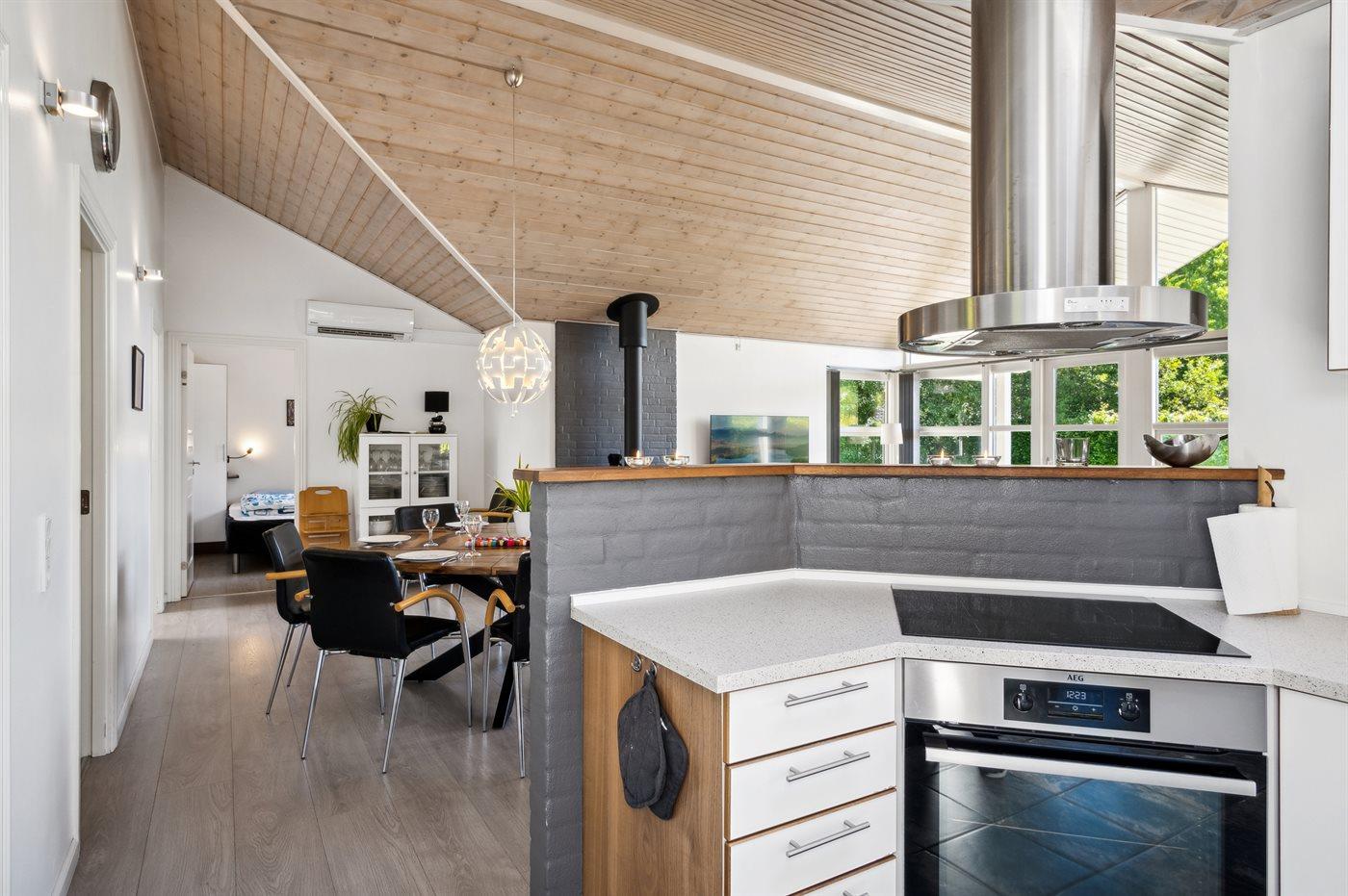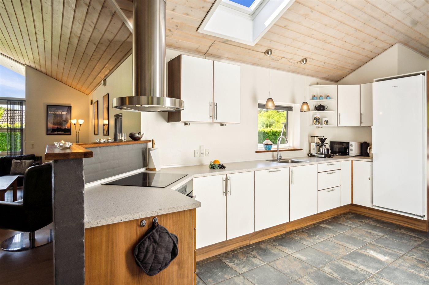 Køkkenet er udstyret med 1 køleskab. Der er 4 induktionskogeplader, varmluftovn, mikrobølgeovn samt opvaskemaskine.