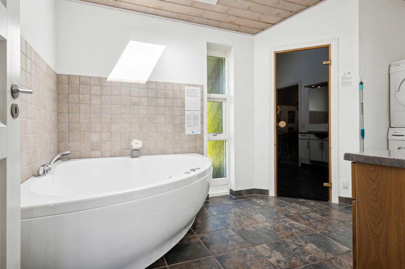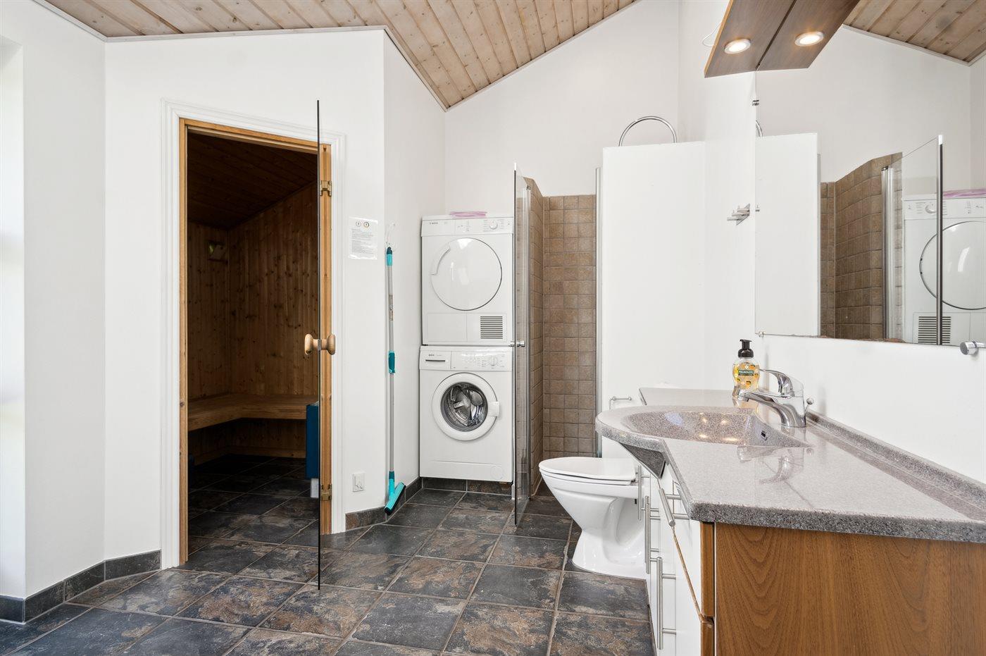 Der er 2 badeværelser med bruseniche og 2 toiletter. Der er gulvvarme på 2 badeværelser. I saunaen er der mulighed for afslapning.