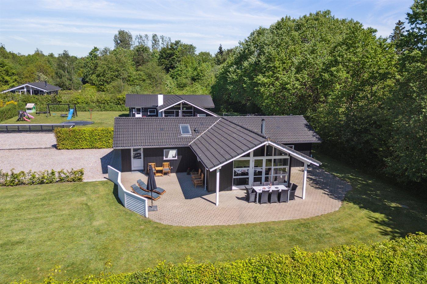 Flot, stort sommerhus meget tæt på svømmehallen, fiskesøen og legepladsen. Her er god plads til hele familien - også udenfor på den store terrasse.