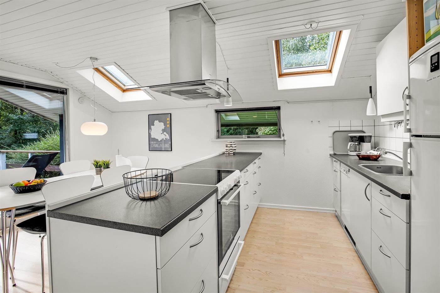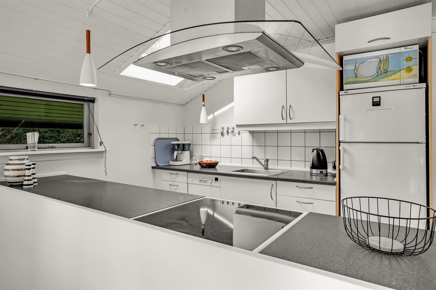 Køkkenet er udstyret med 1 køleskab. Der er 4 keramiske kogeplader, varmluftovn, mikrobølgeovn samt opvaskemaskine.