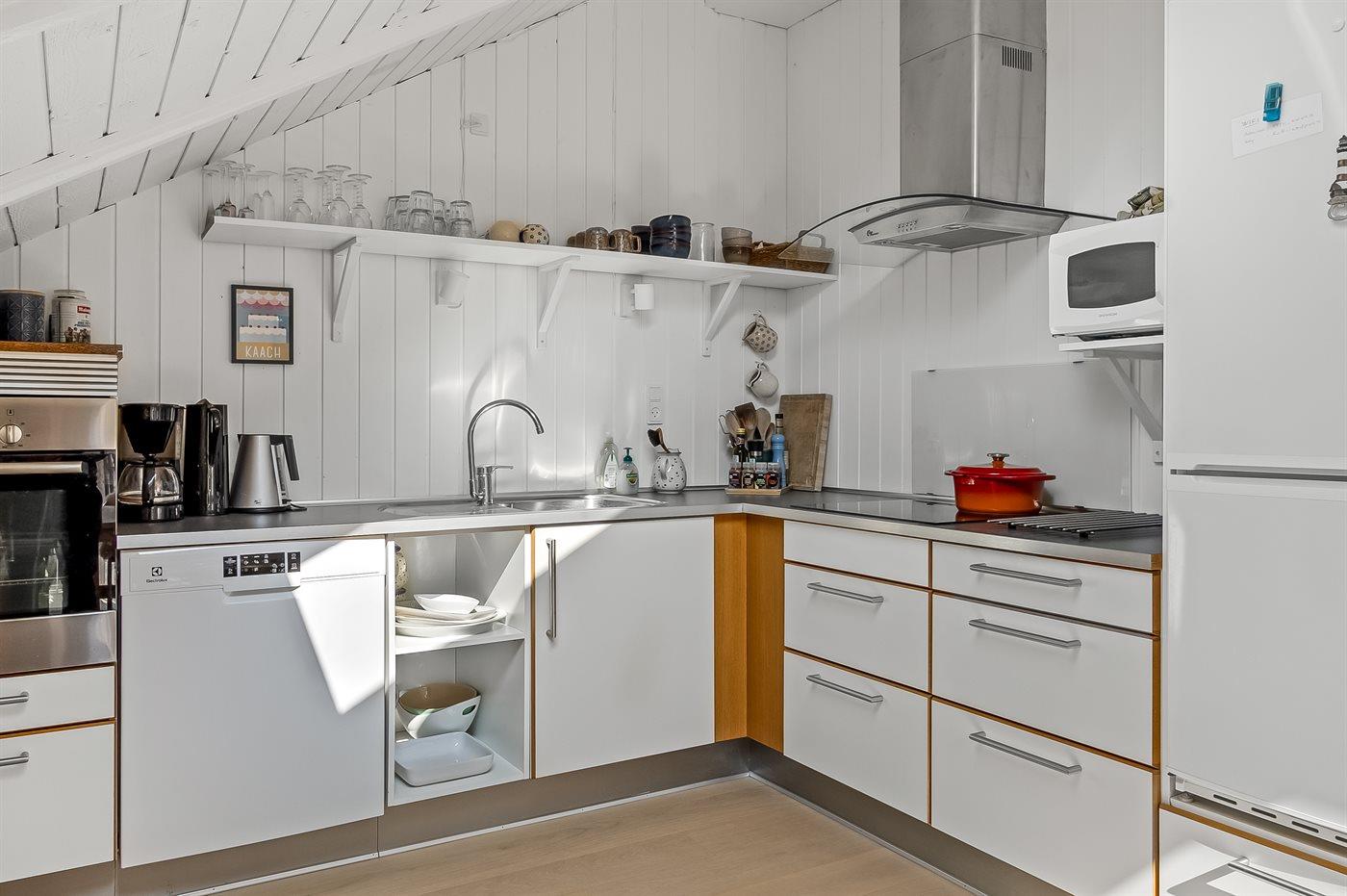 Køkkenet er udstyret med 1 køleskab. Der er 4 keramiske kogeplader, varmluftovn, mikrobølgeovn samt opvaskemaskine.