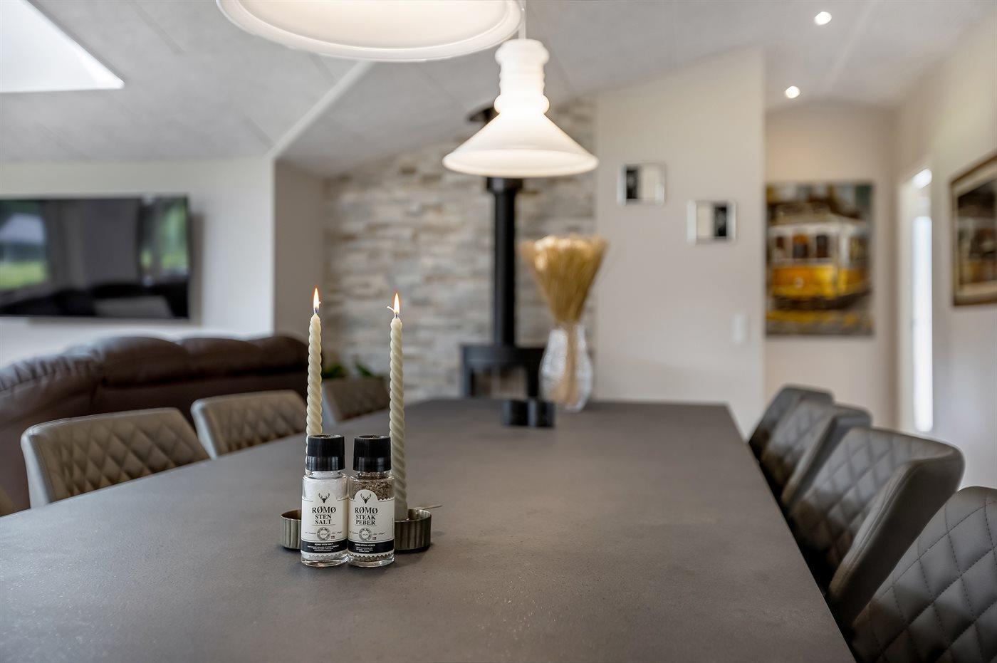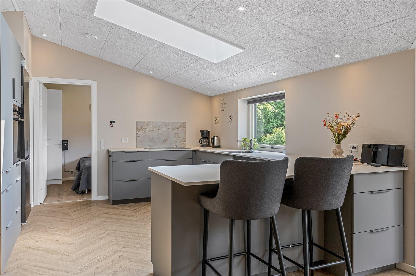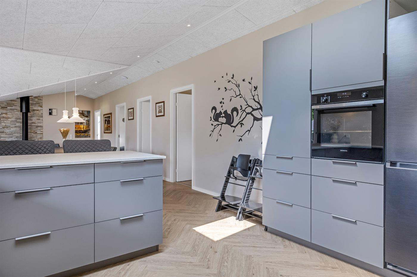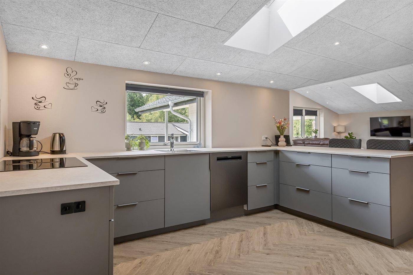 Køkkenet er udstyret med 1 køleskab. Der er 4 induktionskogeplader, varmluftovn, mikrobølgeovn samt opvaskemaskine.