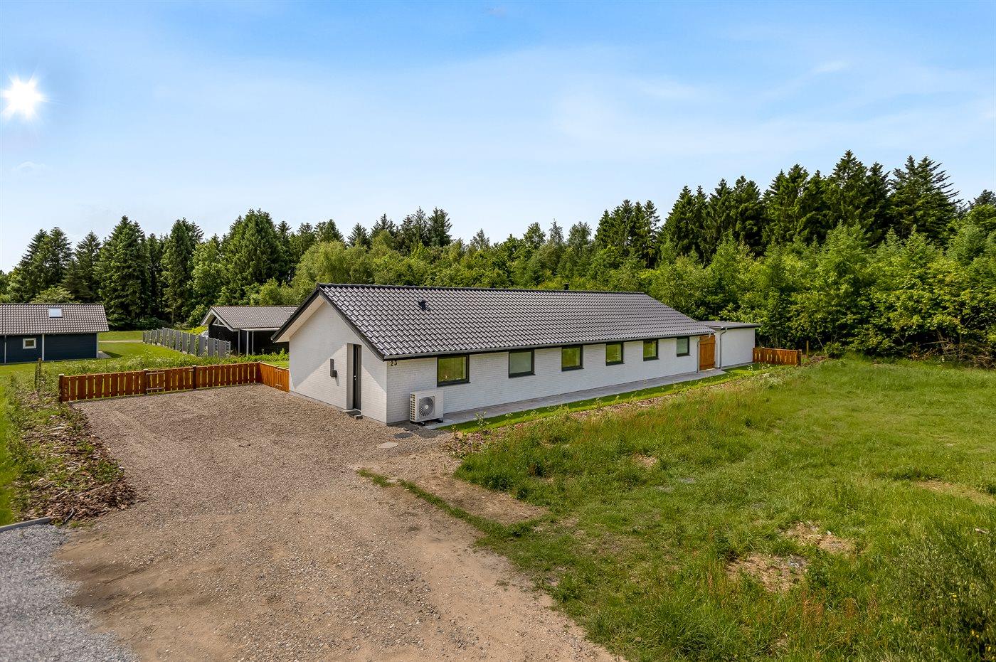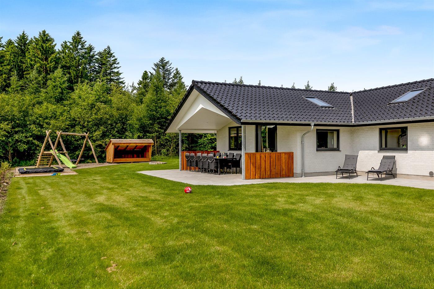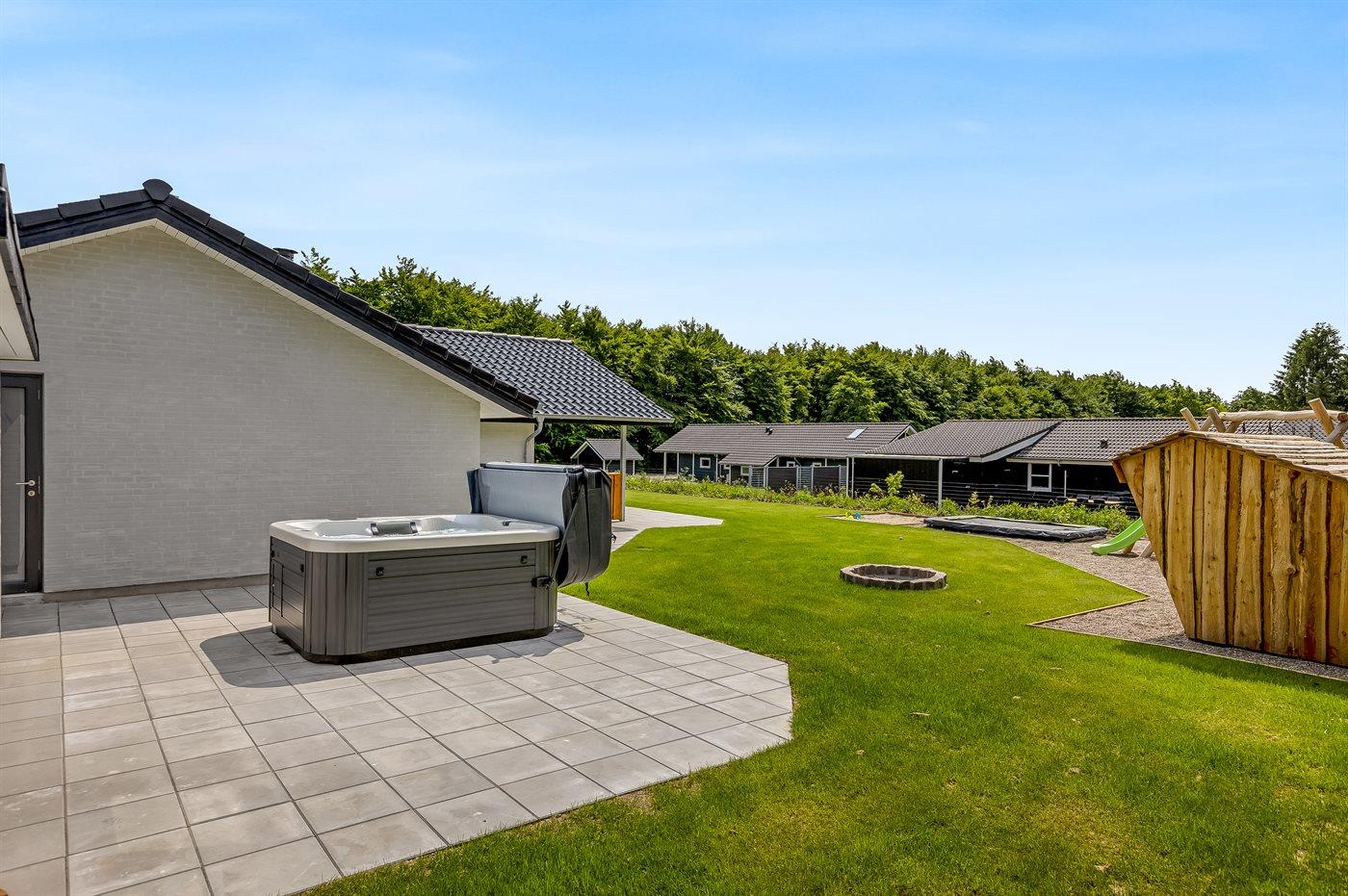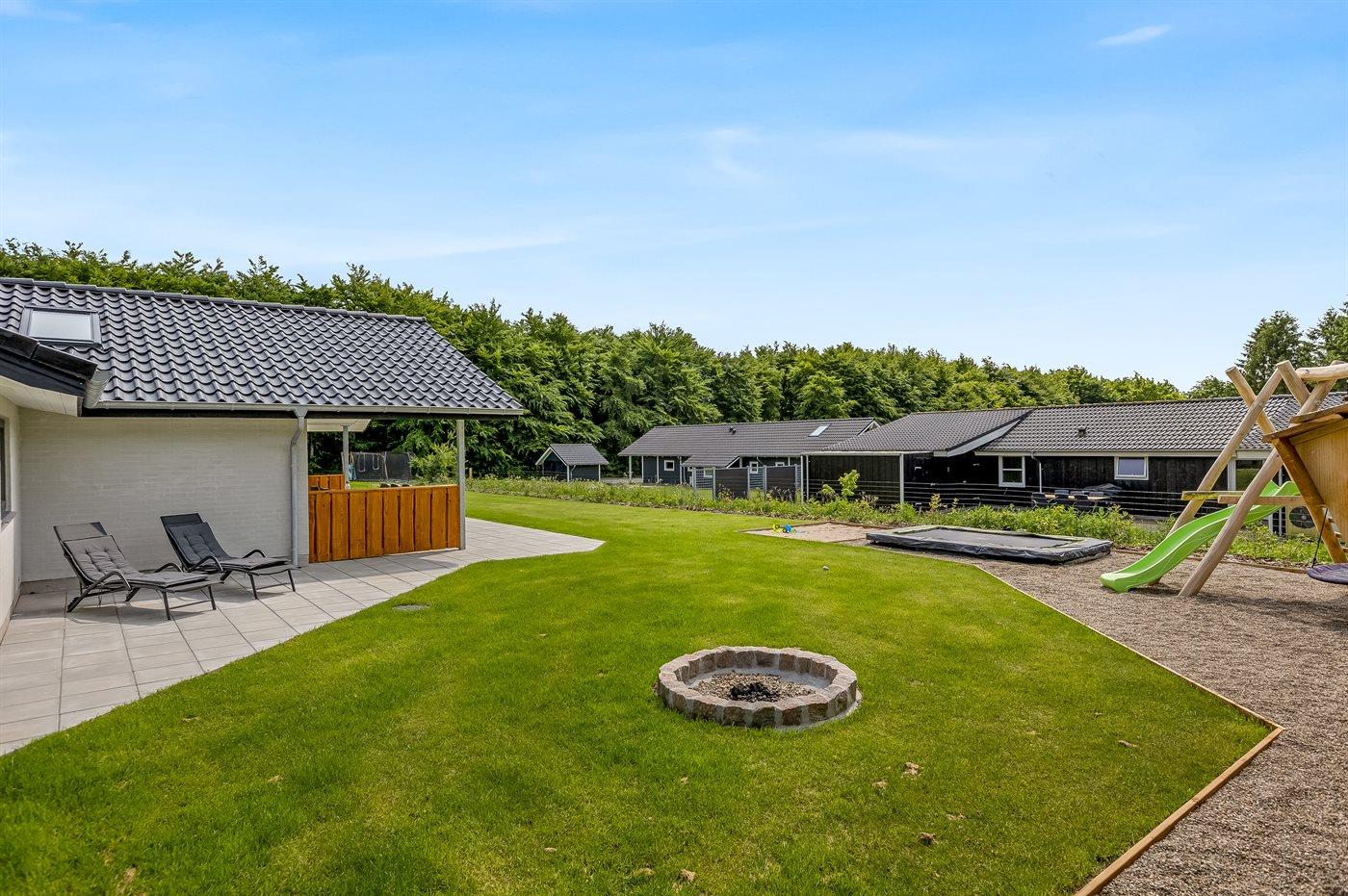 Ferieboligen er beliggende på en 872 m² stor naturgrund. Grunden er indhegnet. Der er 30000 m til havet. Der er 20000 m til Vadehavet. Der er en sø i en afstand af 700 m. Nærmeste forretning er beliggende i en afstand af 800 m. Der er en golfbane i en afstand af 1000 m. Til ferieboligen hører åbent terrasseareal. Desuden er der overdækket terrasse. Gynge. Sandkasse. Trampolin. Rutchebane. Fodboldmål. Der ligger en legeplads i en afstand af 700 m. Bålsted. Shelter. Udendørs sauna. Grill til rådighed. Der er installeret stik til opladning af elbil. Type 2 stik. Med 11 kW ladeeffekt. Parkering ved ferieboligen.