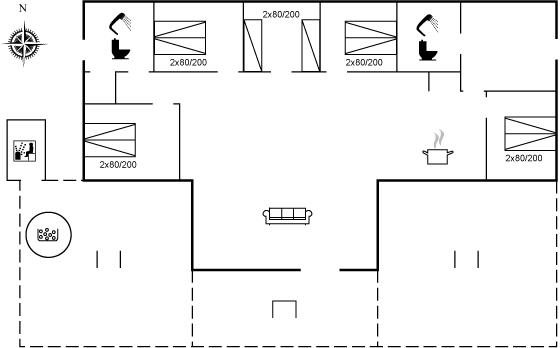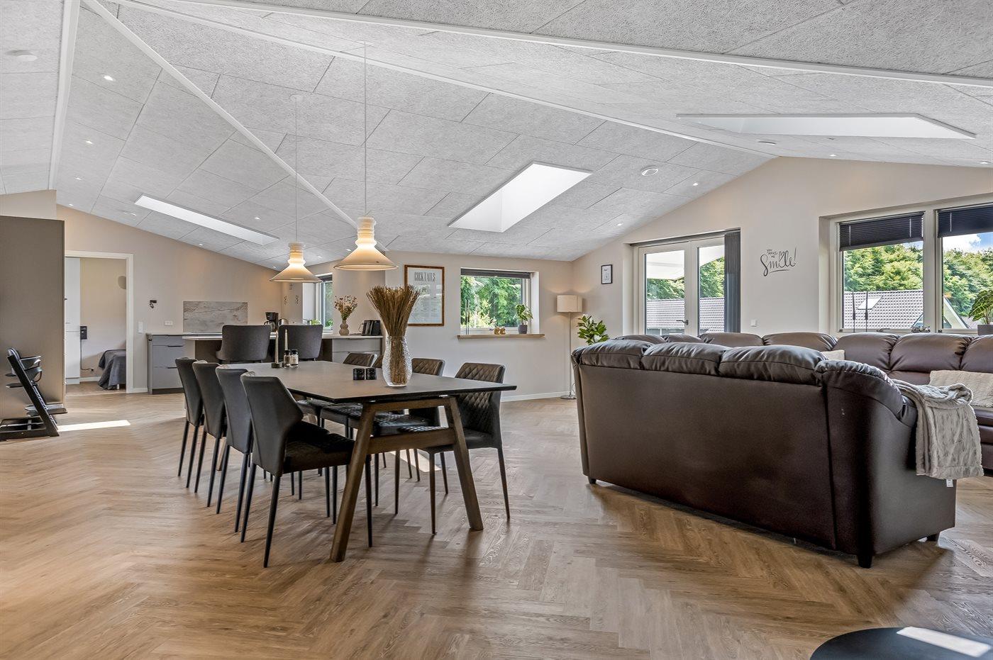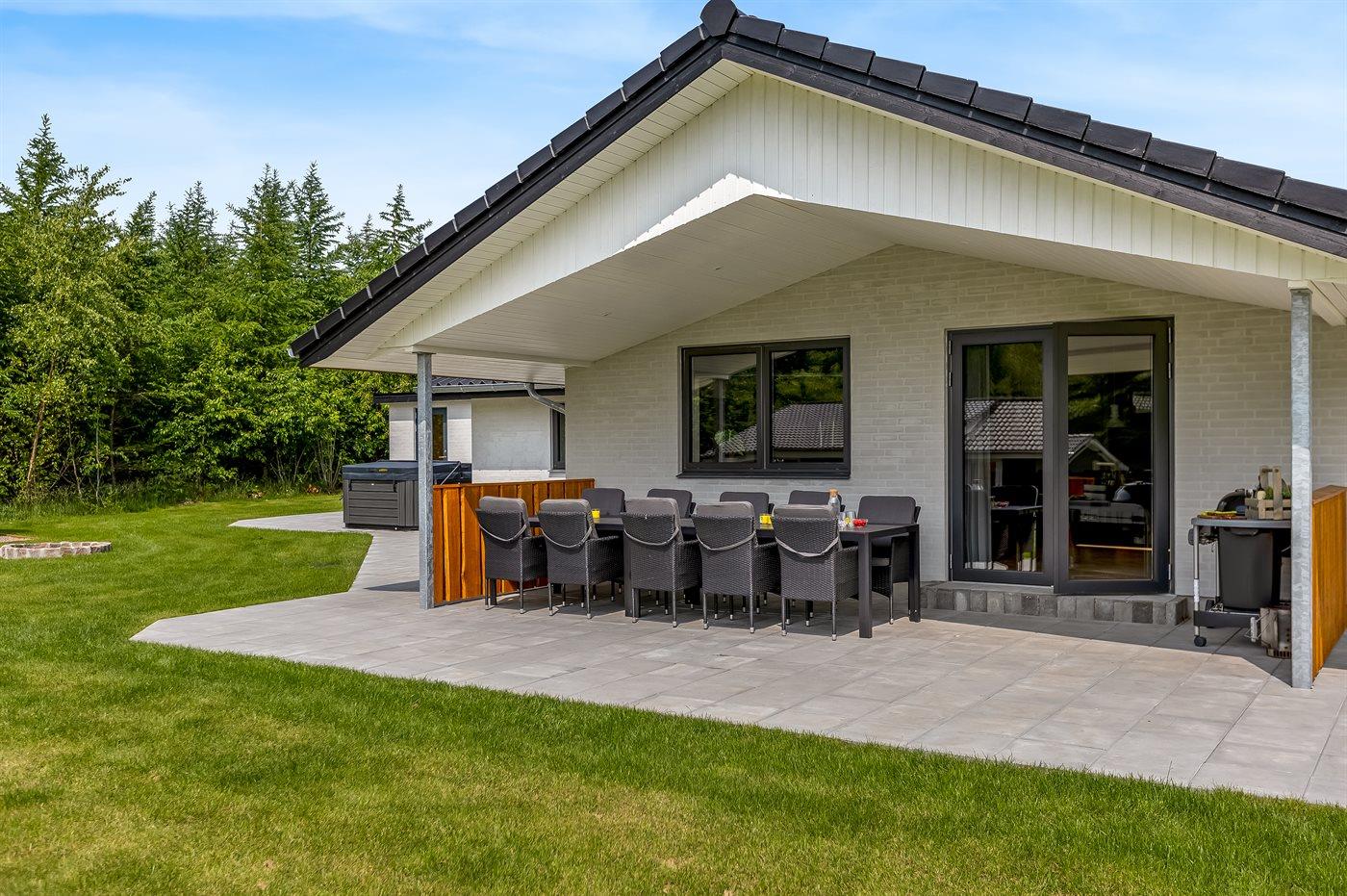 Super lækkert hus med god plads til 10 personer i de 5 soveværelser. Fra den dejlige opholdsstue er der direkte adgang til den store, delvist overdækkede terrasse, og på den vestvendte terrasse er der en skøn udespa til 5 personer samt en udesauna. Sommerhuset er velegnet til 2 familier, idet der er 2 soveafdelinger og 2 badeværelser.
