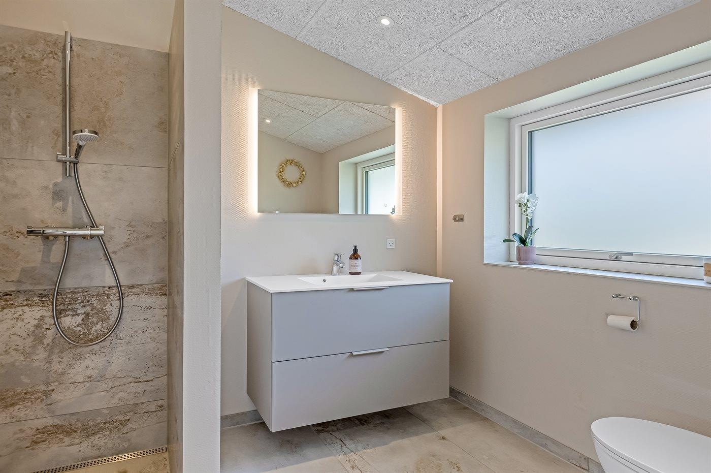 Der er 2 badeværelser med bruseniche og 2 toiletter. Der er gulvvarme på 2 badeværelser.