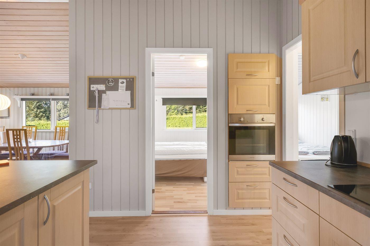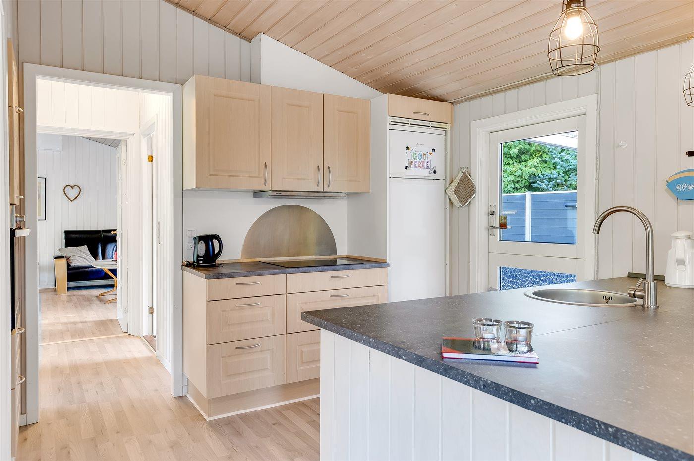 Køkkenet er udstyret med 1 køleskab. Der er 4 keramiske kogeplader, varmluftovn, mikrobølgeovn samt opvaskemaskine.