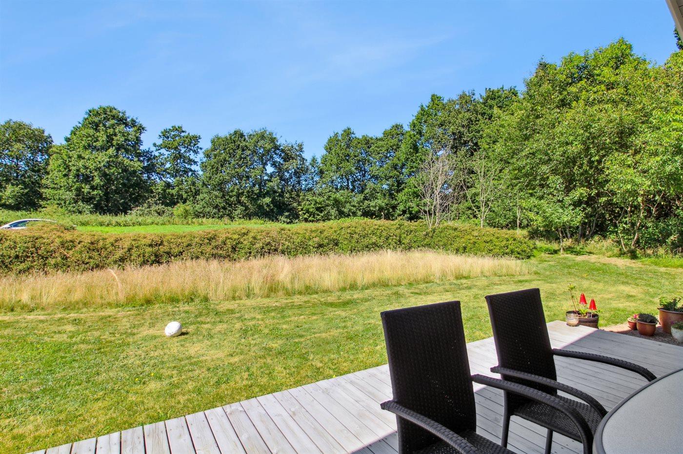 Her er ikke langt til områdets faciliteter samt indkøb. Huset ligger på en dejlig grund, og der er direkte adgang til den delvist overdækkede terrasse fra den kombinerede opholdsstue og køkkenalrum.