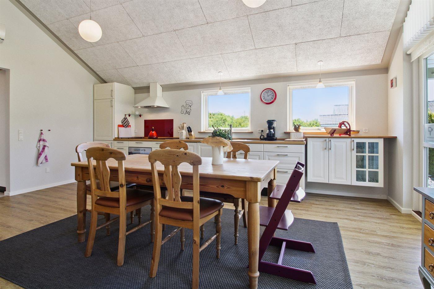 Køkkenet er udstyret med 1 køleskab. Der er 4 induktionskogeplader, varmluftovn, mikrobølgeovn samt opvaskemaskine.