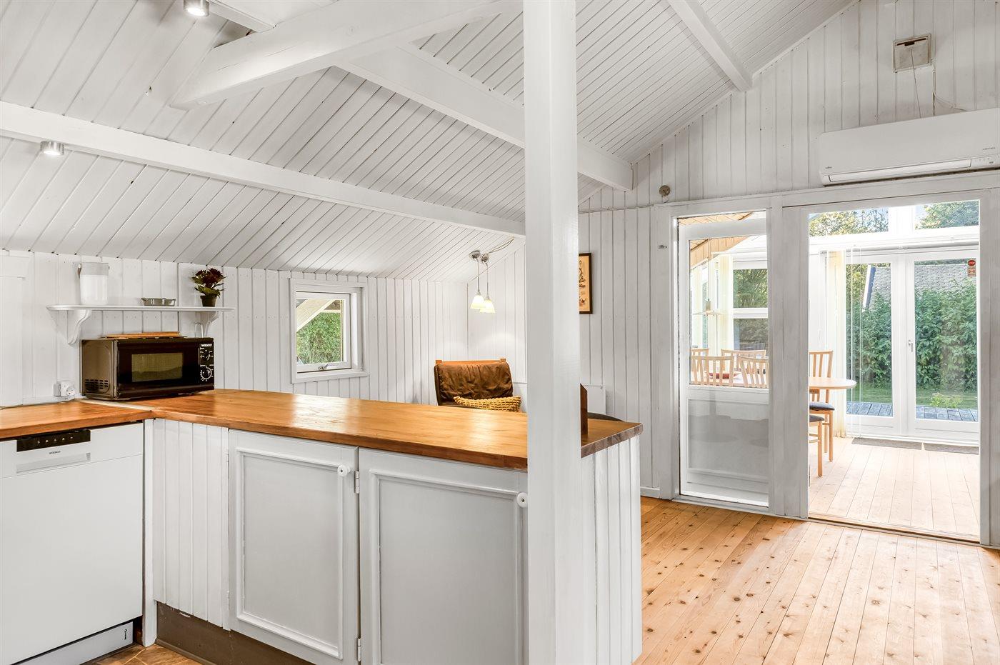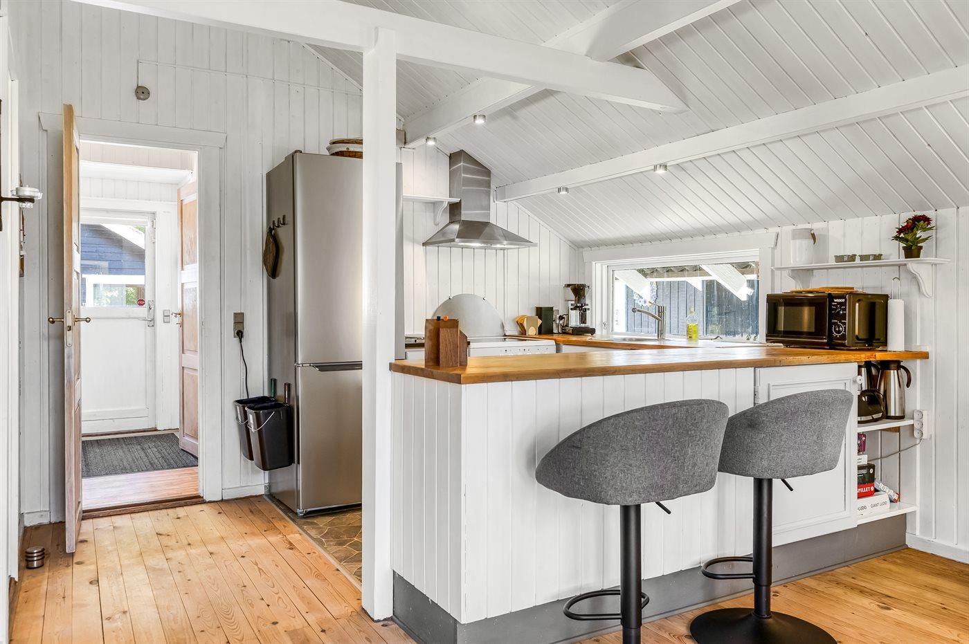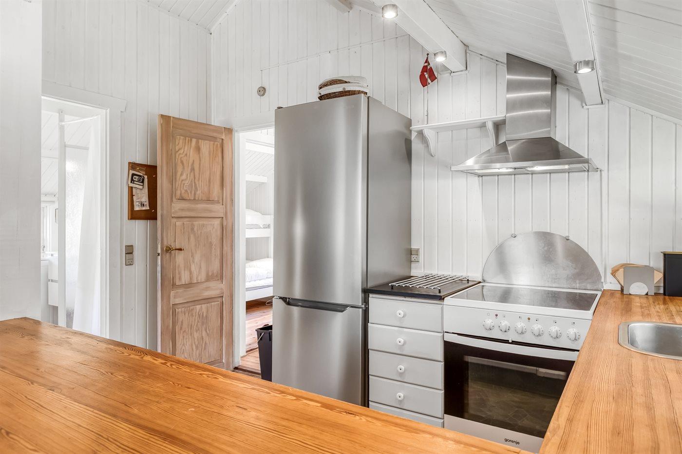 Køkkenet er udstyret med 1 køleskab. Der er 4 keramiske kogeplader, varmluftovn, mikrobølgeovn samt opvaskemaskine.