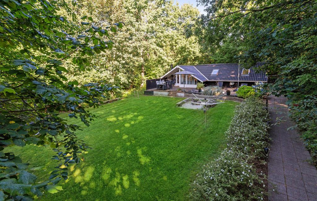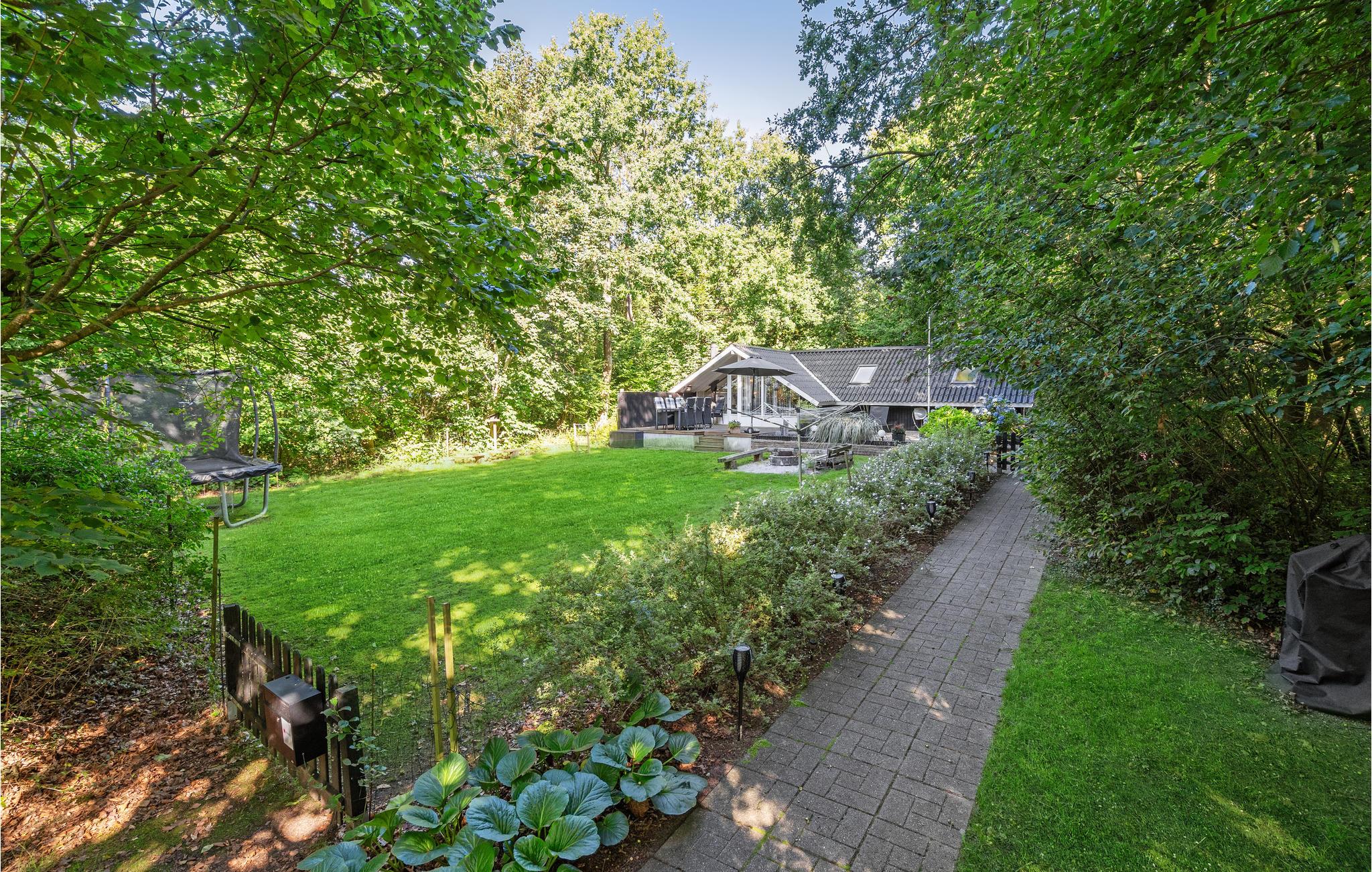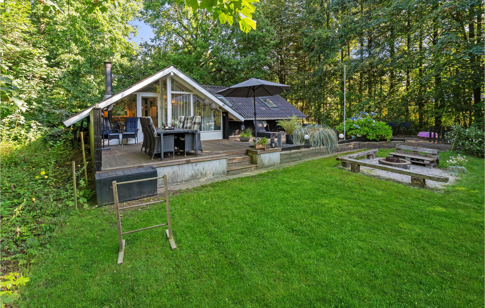 Beliggende på en rolig grund blødt omfavnet af store skovtræer, inviterer denne skjulte perle til en fredfyldt ferie i ugenerte omgivelser. Det veludstyrede feriehus med smagfuld atmosfære skaber den perfekte ramme om dejlige dage med nærvær og samvær. Tilbered lækre måltider i køkkenet, nyd hinandens selskab ved spisebordet og se en film i sofaen om aftenen. Måske med hjemmebagt kage til? Huset og haven vil begejstre både store og små. Slå jer ned på terrassen med en bog, mens jeres børn tumler på trampolinen eller går på opdagelse i junglen. Når mørket falder på, kan I samles omkring bålpladsen og bage snobrød eller riste skumfiduser over ilden og fortælle hinanden uhyggelige historier.