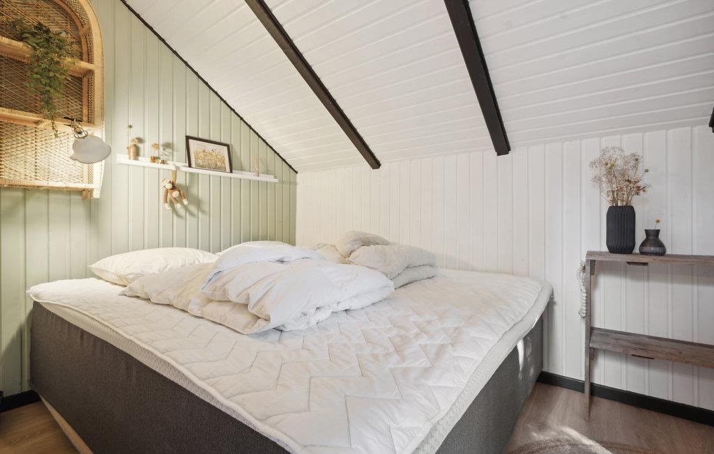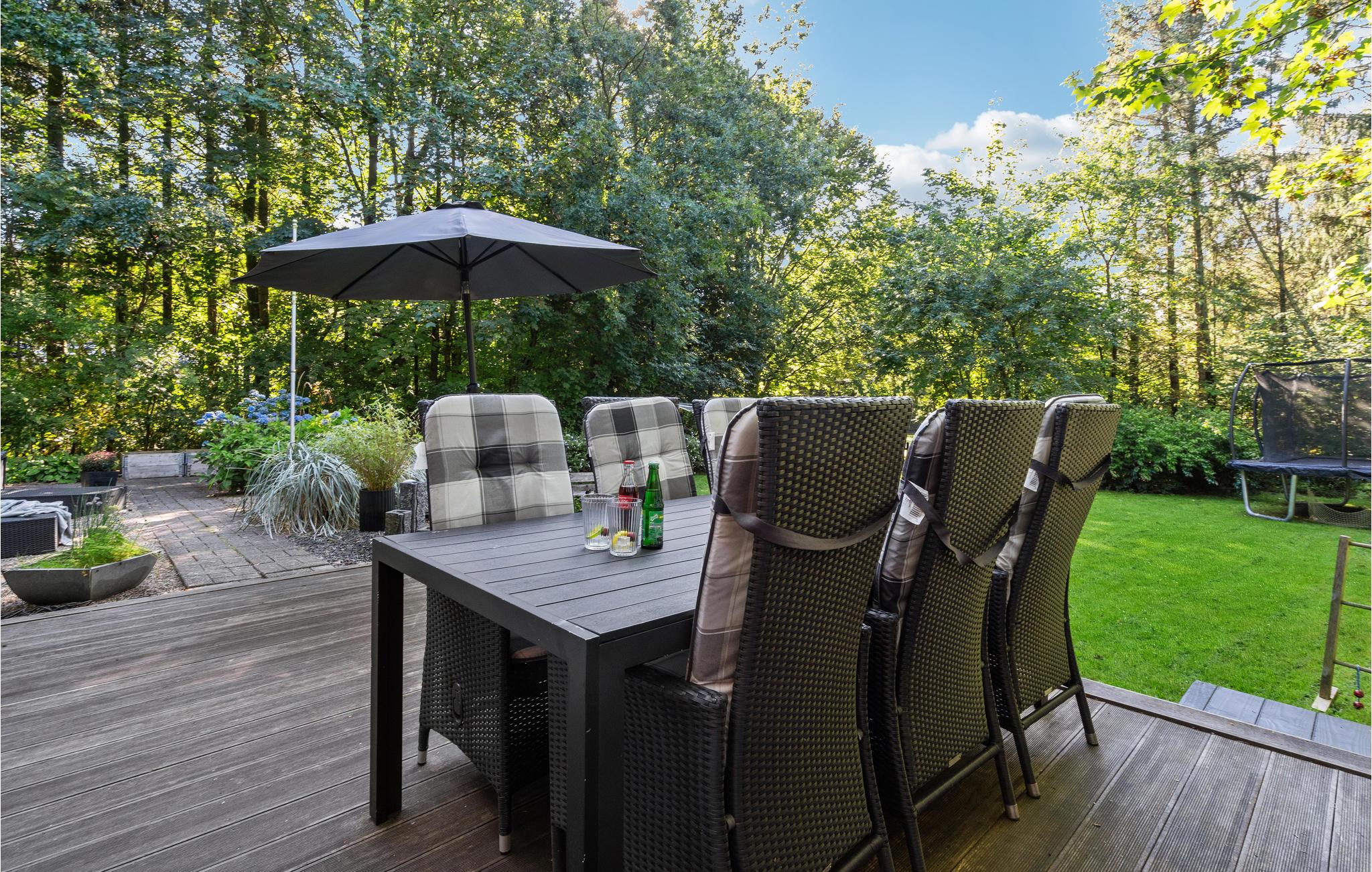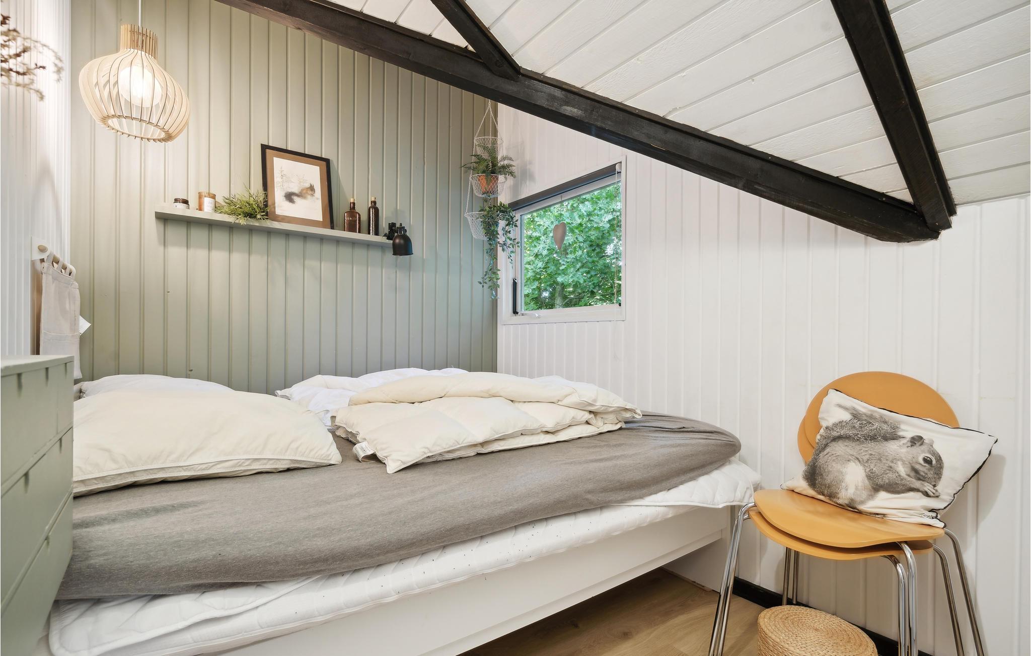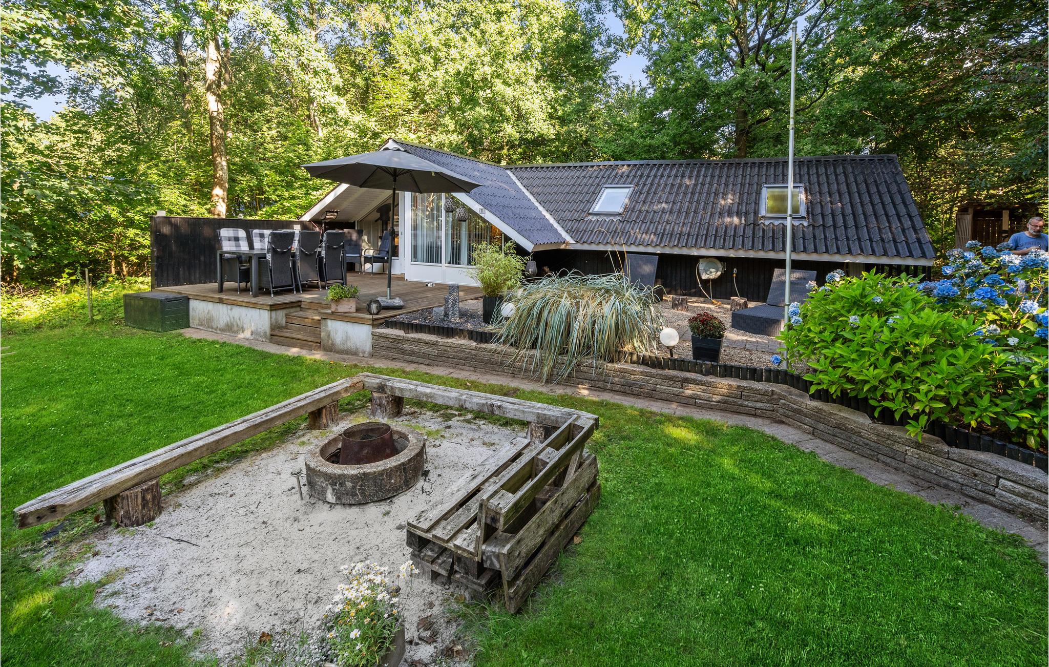 Beliggende på en rolig grund blødt omfavnet af store skovtræer, inviterer denne skjulte perle til en fredfyldt ferie i ugenerte omgivelser. Det veludstyrede feriehus med smagfuld atmosfære skaber den perfekte ramme om dejlige dage med nærvær og samvær. Tilbered lækre måltider i køkkenet, nyd hinandens selskab ved spisebordet og se en film i sofaen om aftenen. Måske med hjemmebagt kage til? Huset og haven vil begejstre både store og små. Slå jer ned på terrassen med en bog, mens jeres børn tumler på trampolinen eller går på opdagelse i junglen. Når mørket falder på, kan I samles omkring bålpladsen og bage snobrød eller riste skumfiduser over ilden og fortælle hinanden uhyggelige historier.