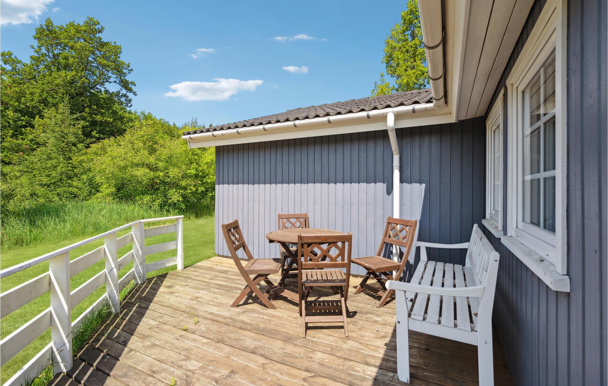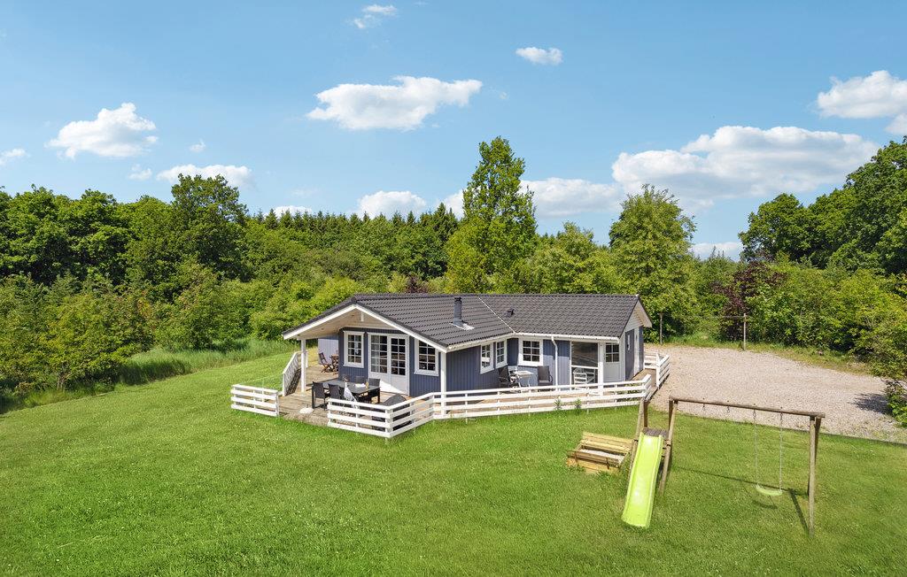 Dette dejlige træhus ligger på en åben og lys grund, der er omkranset af høj bevoksning, hvilket giver fornemmelsen af, at huset ligger i en lysning i en skov.