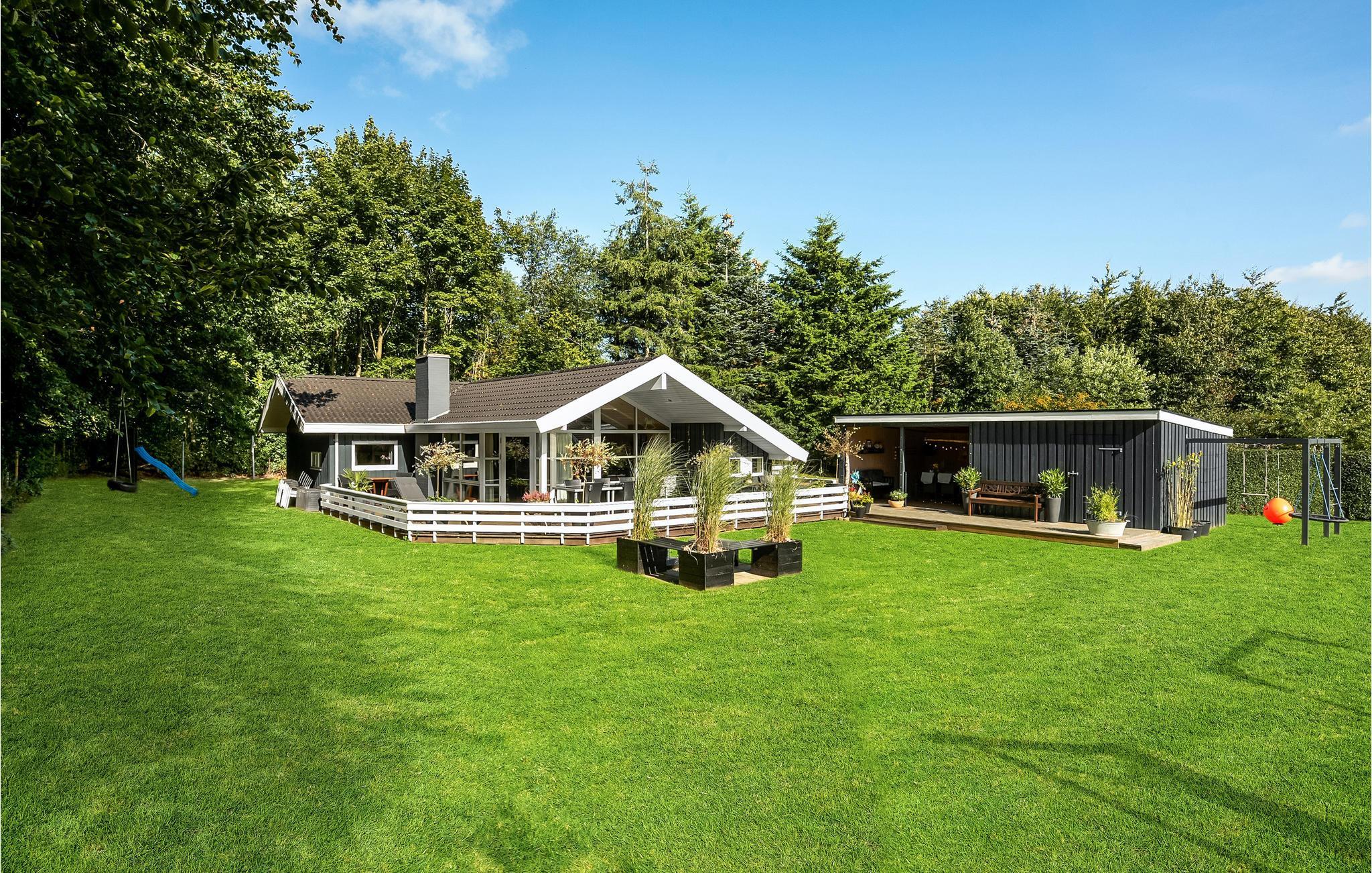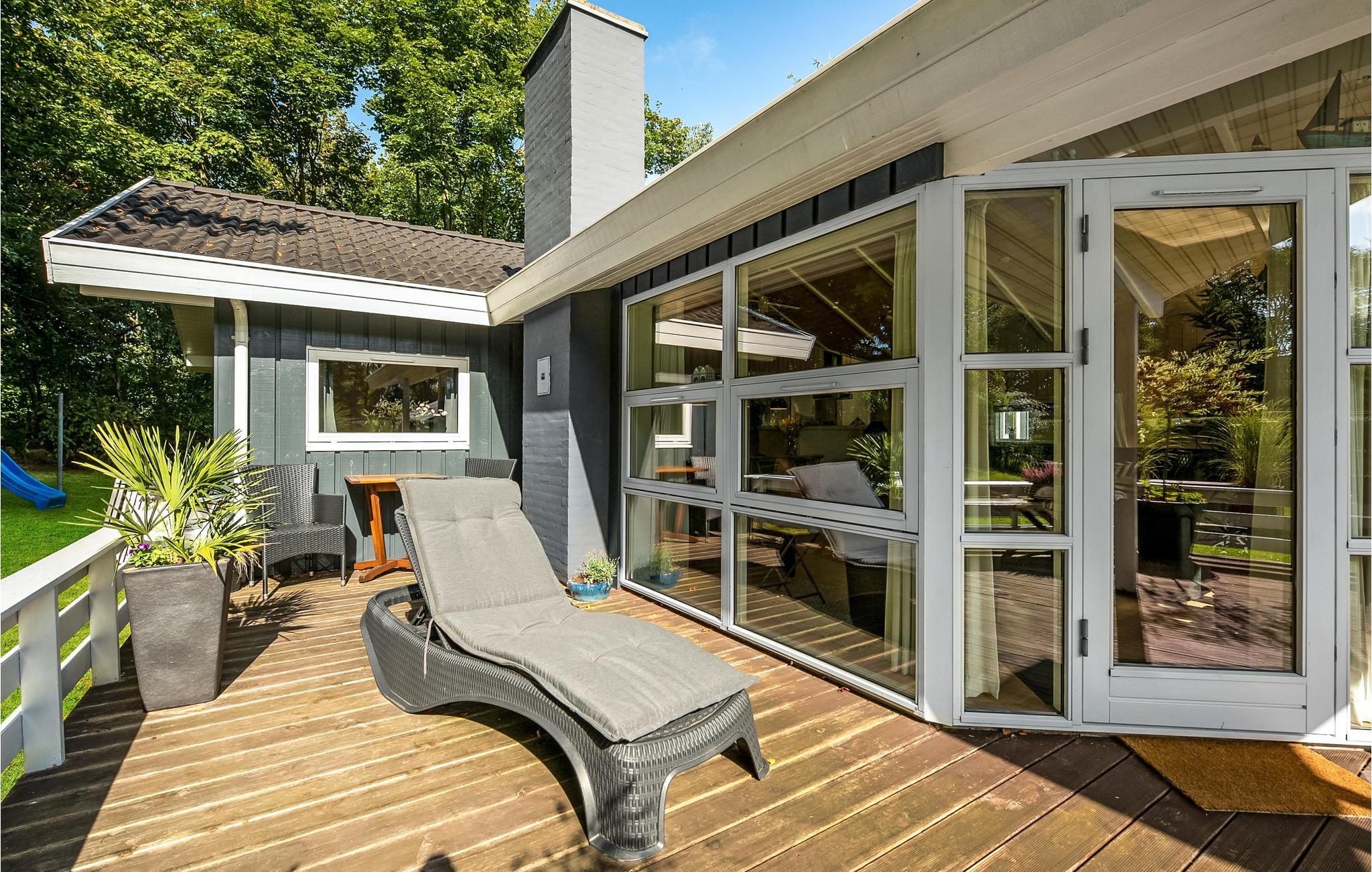 Moderne træferiehus i Arrild Ferieby med spabad, sauna og stor terrasse tæt på fiskesøen.